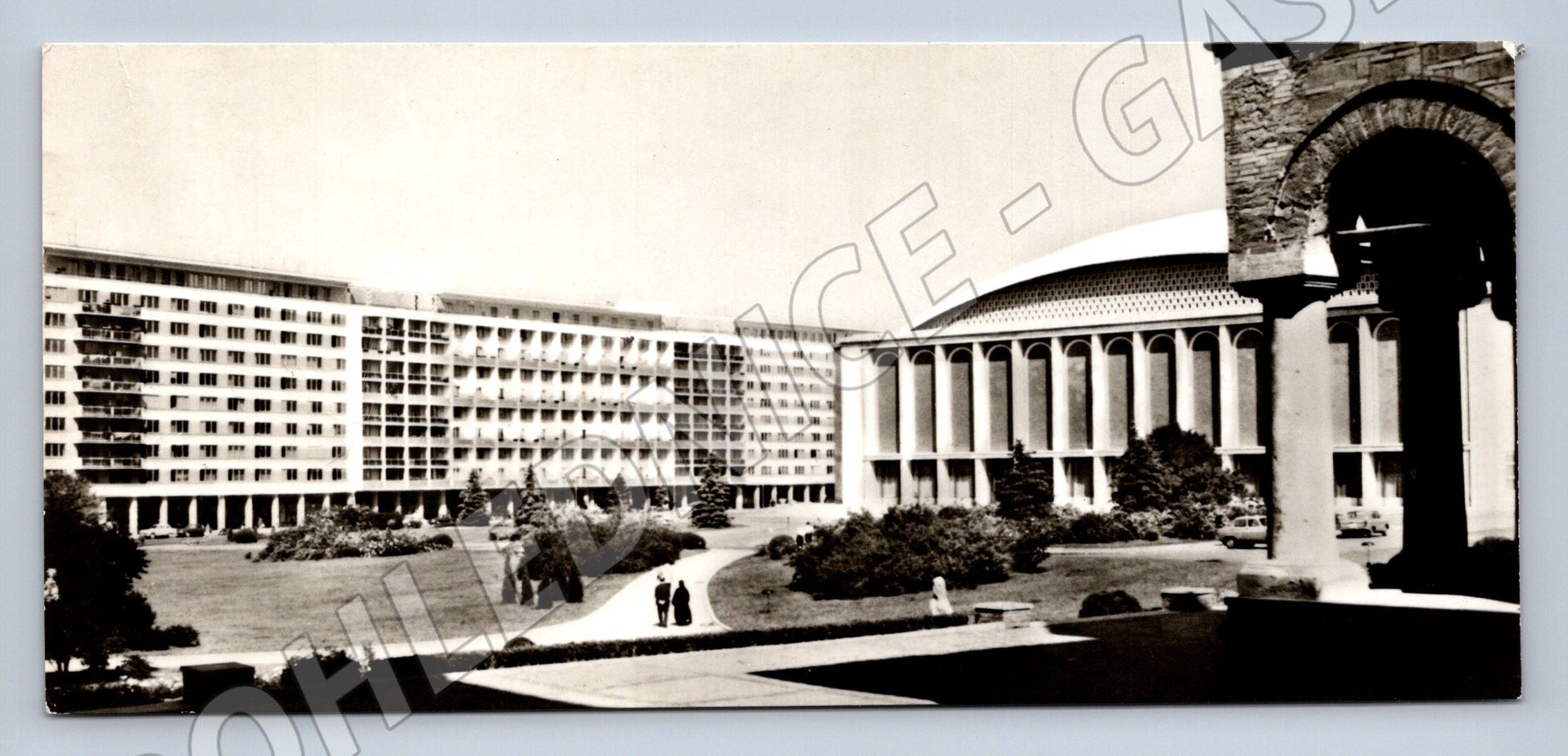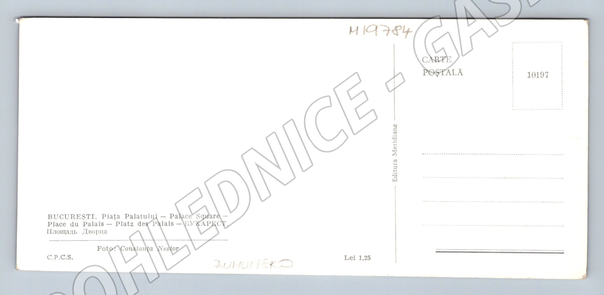 Originální černobílá pohlednice zachycující Palácové náměstí (Piața Palatului) v Bukurešti, hlavním městě Rumunska. Na pohlednici je vidět moderní urbanistická architektura s charakteristickými budovami i monumentálním sloupovím. Pohlednice je nepopsaná a ve velmi dobrém stavu, vydaná nakladatelstvím Editura Meridiane. Fotografii pořídila Constanța Nestor. Na zadní straně pohlednice jsou popisky ve více jazycích včetně rumunštiny, ruštiny, němčiny a francouzštiny. Skvělý doplněk pro sběratele historických evropských pohlednic a milovníky rumunské architektury.