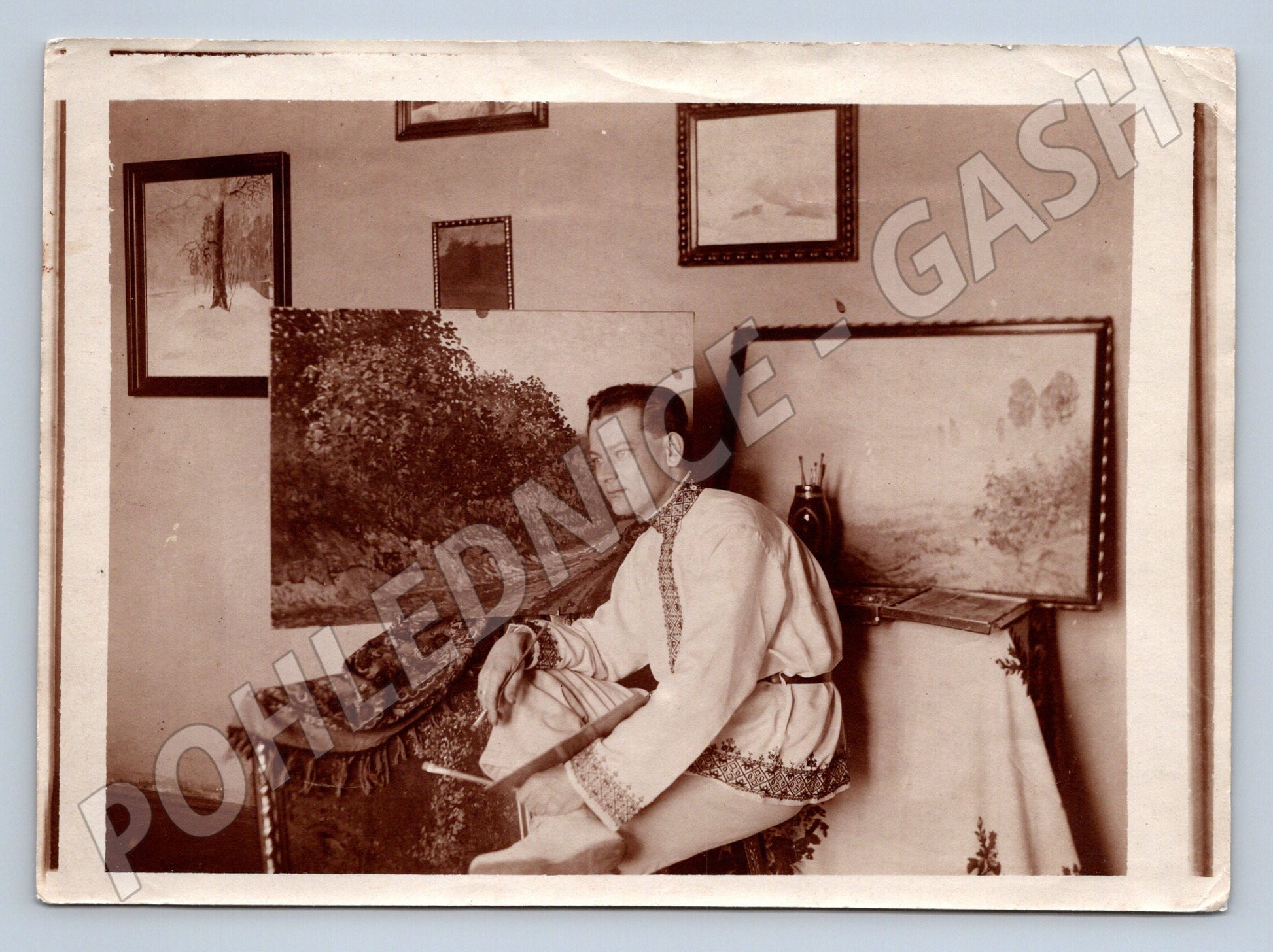 Starší černobílá pohlednice zobrazující muže v kroji sedícího v interiéru obklopeného obrazy. Fotografie zachycuje tradiční etnografický motiv a je vhodná pro sběratele se zájmem o lidovou kulturu a historii. Stav velmi dobrý, lehce opotřebené rohy, čistá zadní strana, bez popisu či známky. Odhadované stáří pohlednice je první polovina 20. století. Skvělý přírůstek do kolekce pohlednic se zaměřením na etnografii nebo lidové kroje.