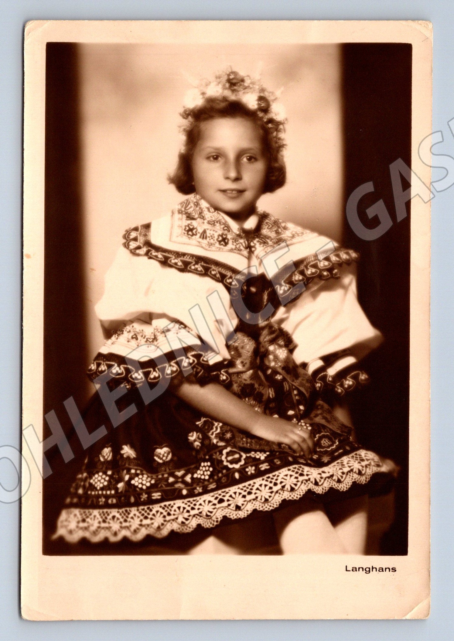 Originální černobílá pohlednice s portrétem malé dívky v tradičním lidovém kroji s výraznou krajkou a květinovým věnečkem na hlavě. Fotografie byla pořízena ateliérem Langhans. Pohlednice nese stopy stáří a je v dobrém sběratelském stavu, rubová strana je čistá a nenese známky korespondence. Ideální doplněk sbírky etnografie a lidových krojů z českého prostředí, vhodné též pro milovníky starých fotografií. Přibližné stáří 1. polovina 20. století.