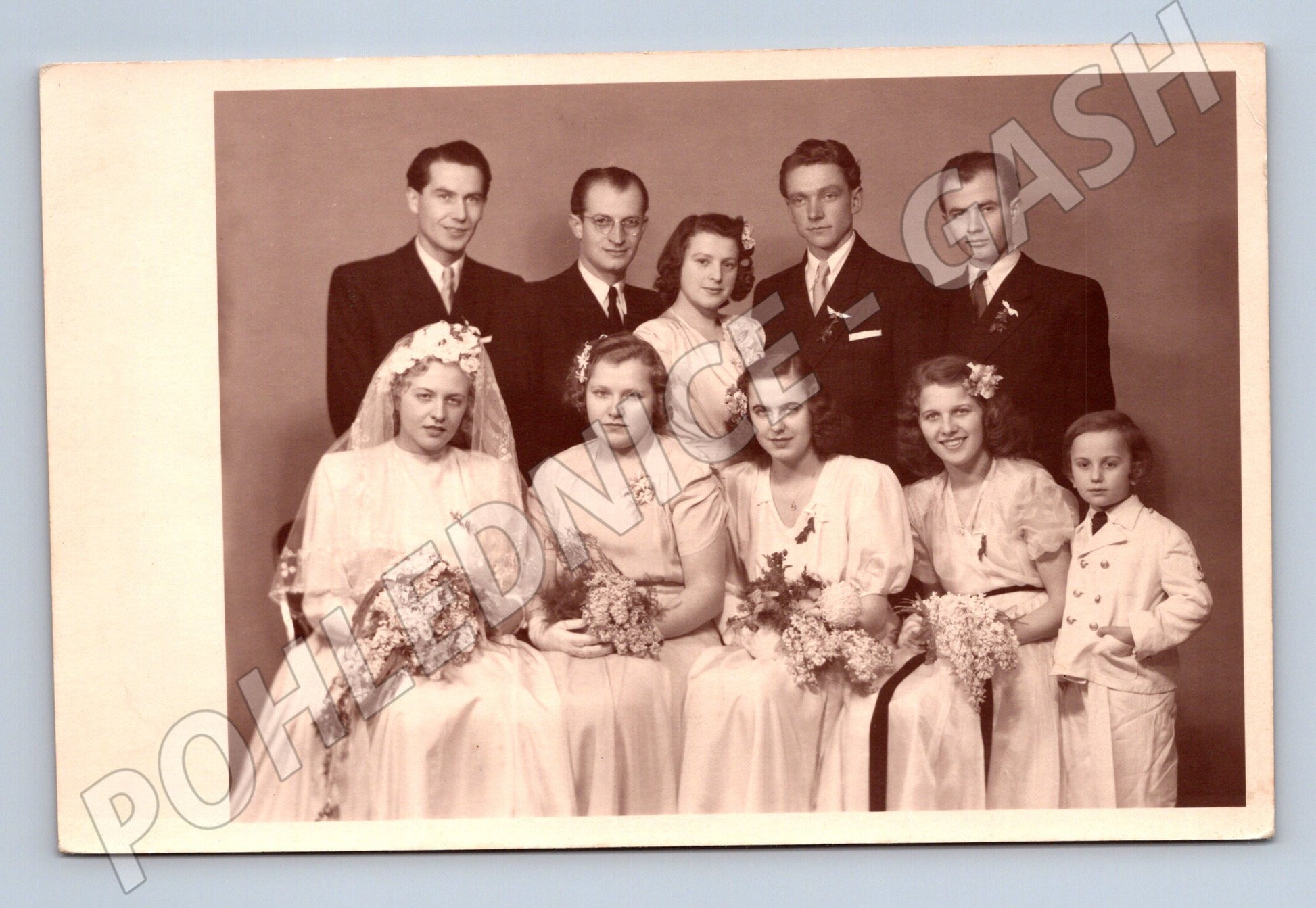 Nabízím originální černobílou svatební pohlednici z období první poloviny 20. století, zřejmě z ČSR před rokem 1950. Na fotografii je zachycena svatba – skupinový portrét ženicha, nevěsty, družiček, svědků a hostů ve slavnostním oblečení i s květinami. Pohlednice je ve velmi dobrém stavu bez výrazných poškození, s jasnými detaily a dobovou patinou. Zadní strana je čistá, s razítkem ateliéru Ateliér Silva, Praha XII. a číslem. Krásný sběratelský kousek zachycující atmosféru dávných let a cenný doklad dobové kultury a módy. Ideální pro sběratele historických pohlednic, milovníky etnografie a zájemce o dobové portréty. Rozměr cca 9 x 14 cm.