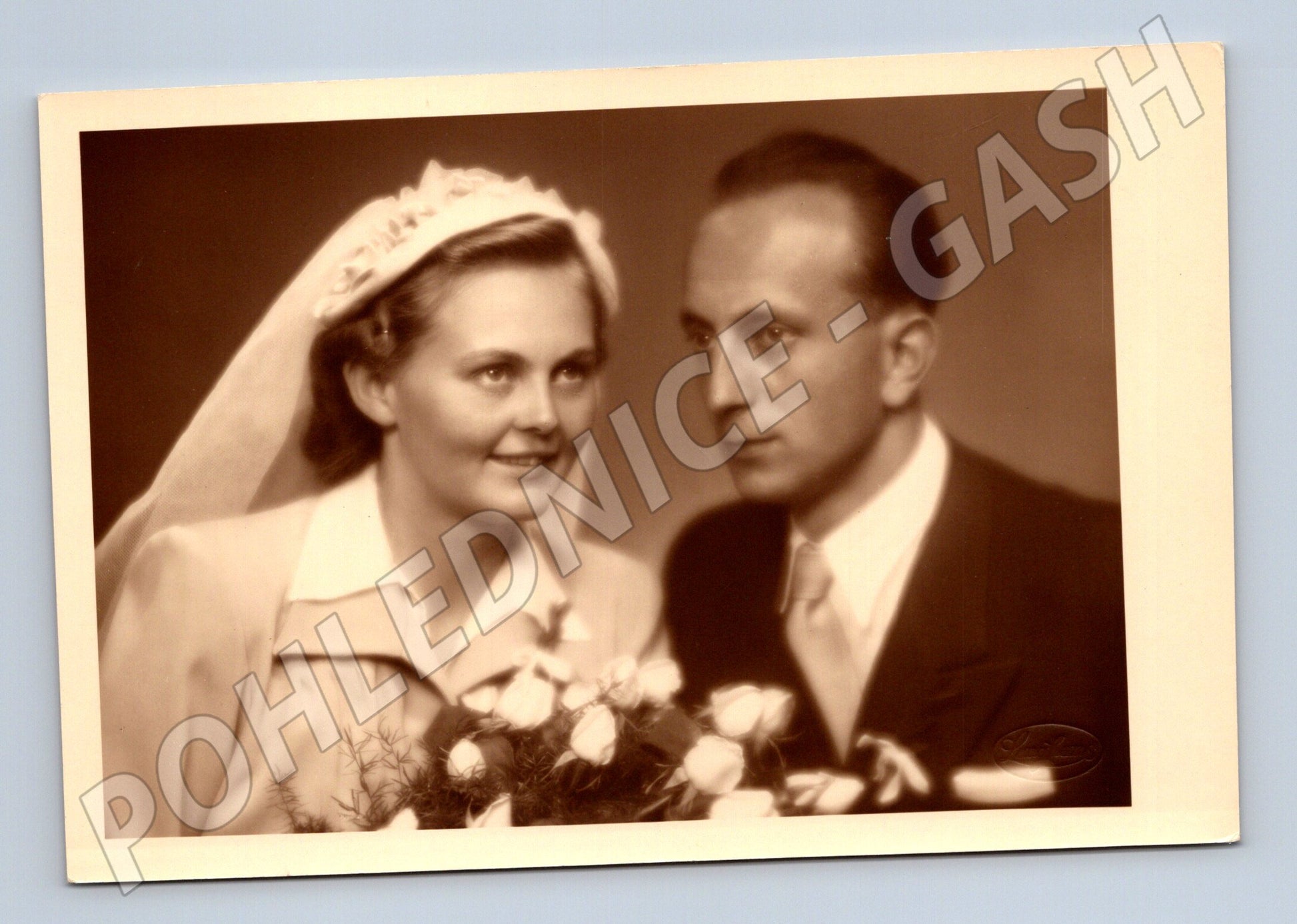 Originální černobílá svatební pohlednice z období první poloviny 20. století. Na přední straně je profesionální ateliérový portrét nevěsty a ženicha s kyticí květin. Pohlednice má klasický malý formát, je v pěkném sběratelském stavu bez popisu na zadní straně. Vhodné jako doplněk sbírky historických portrétních pohlednic nebo retro dekorace.