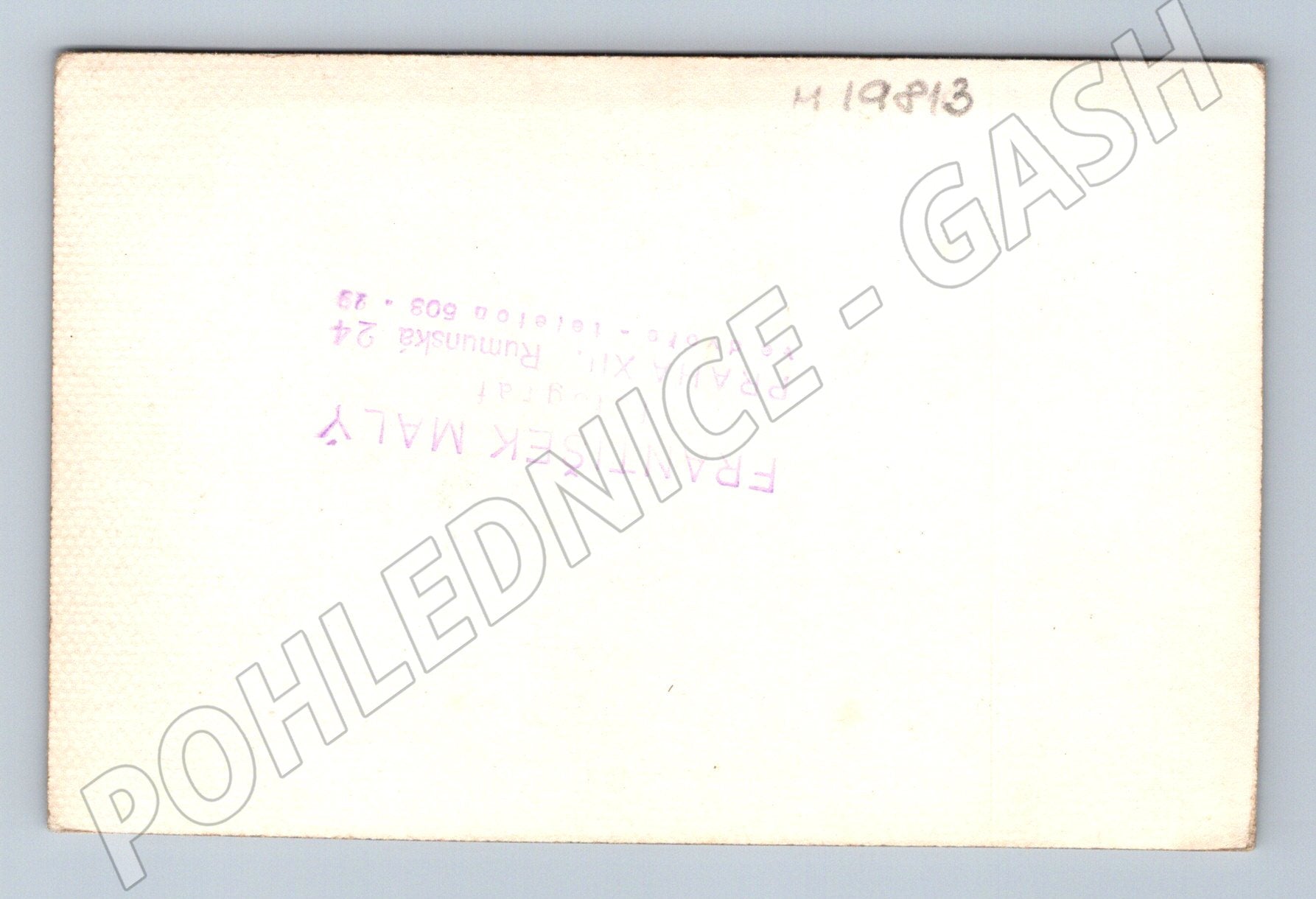Originální černobílá pohlednice zachycující slavnostní okamžik zřejmě ze svatby – polibek muže v uniformě a ženy s tradičním závojem. Na zadní straně pohlednice je fialové razítko FRANTIŠEK MALÝ, umělecký fotograf Praha XII. (Rumunská 24) a rukou psané označení H 19413. Fotografie má reportážní charakter a působí dojmem zachycení významné osobnosti nebo společenské události v meziválečném či poválečném období. Stav pohlednice odpovídá stáří, bez větších poškození, pouze drobné stopy používání. Skvělý doplněk do sbírky historických pohlednic s tematikou osobností a společenských událostí.