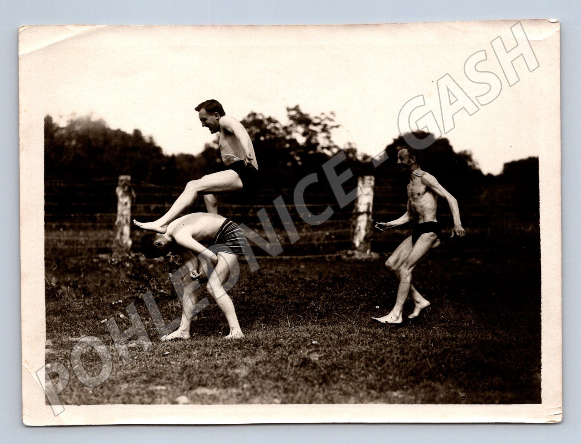 Originální černobílá pohlednice menšího formátu z období před rokem 1950. Na přední straně je zachycena skupina tří mladých mužů v plavkách při venkovní hře na louce, pravděpodobně u Užhorodu, jak je poznamenáno na zadní straně. Typická atmosféra meziválečného či poválečného Československa, vhodná do tematických nebo regionálních sbírek. Pohlednice je v dobrém stavu s drobnými známkami stáří (ohnuté rohy, flíčky na zadní straně). Zajímavý pohled do každodenního života a volnočasových aktivit této doby.
