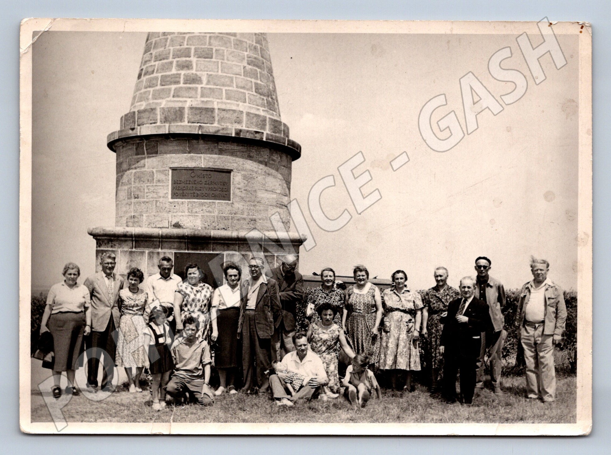 Nabízím originální černobílou pohlednici zachycující skupinu lidí u památníku nebo rozhledny ze žulového zdiva, pravděpodobně na území Česka. Tato pohlednice pochází ze starší doby (cca 50. léta 20. století – odhad dle stylu oblečení a tisku). Na pohlednici je skupina mužů, žen i dětí pózujících před památnou stavbou, v jejíž přední části je umístěna pamětní deska. Stav pohlednice odpovídá stáří – rohy jsou mírně ohnuté, povrch nese drobné známky opotřebení. Zadní strana je čistá, popsaná pouze číslem a poznámkou. Skvělý sběratelský kousek pro milovníky historie, architektury a starých pohlednic z českých krajů.