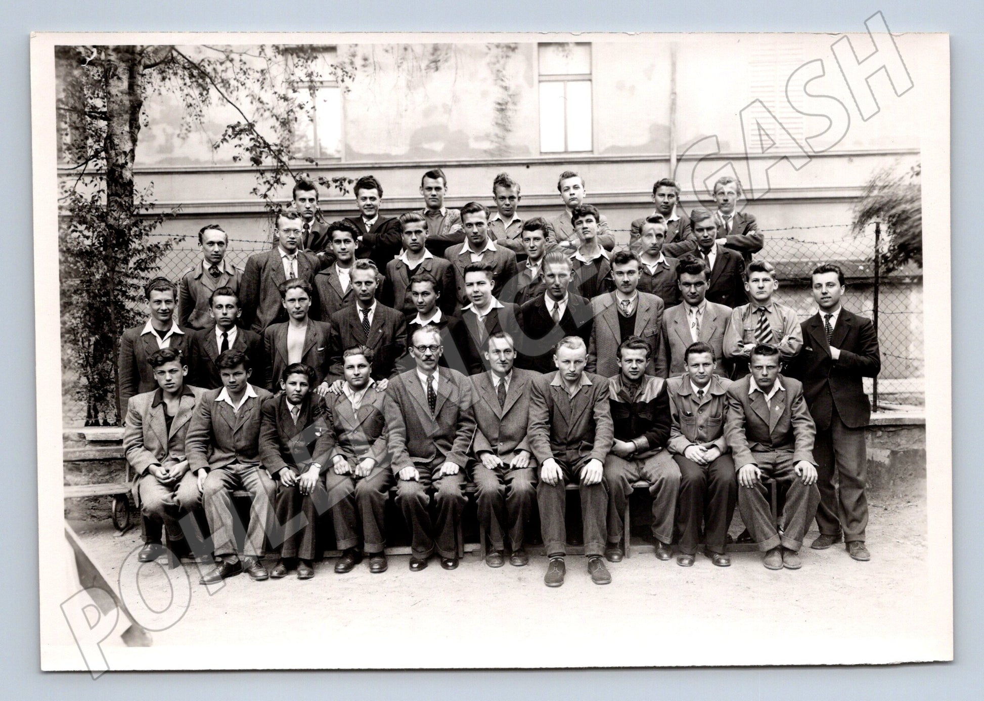 Starší černobílá pohlednice zachycující skupinový portrét mužů, pravděpodobně studentů nebo absolventů školy, ve formálním oblečení před budovou. Na zadní straně pohlednice je ručně napsané číslo, zbytek je čistý. Pohlednice je ve velmi dobrém stavu, bez viditelných poškození, lehké známky stáří. Vhodné pro sběratele historických fotografií a zájemce o společenskou historii první poloviny 20. století. Přesné místo ani rok není specifikován, ale zvolený styl oblečení a provedení odpovídají období 30.–50. let 20. století.