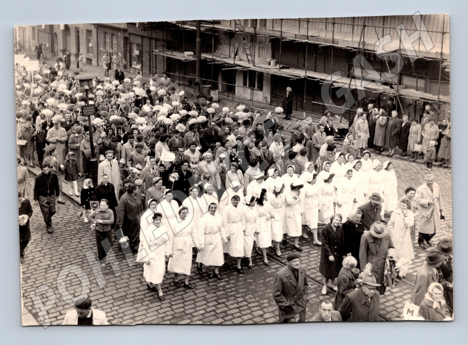 Originální černobílá pohlednice zachycující průvod lidí městem, pravděpodobně z období první poloviny 20. století. Pohlednice zobrazuje dav žen v bílém, patrně zdravotní sestry nebo dobrovolnice, který je doprovázen dalšími účastníky pochodu a okolo stojícími diváky. Na pozadí jsou městské domy a dobová architektura. Na zadní straně je ručně napsán letopočet Máj 1936 , což může odkazovat na tematiku májových slavností nebo společenskou akci z této doby. Pohlednice je ve velmi dobrém stavu, neprošlá poštou, bez známky. Skvělý sběratelský kousek dokumentující život v ČSR před rokem 1950.