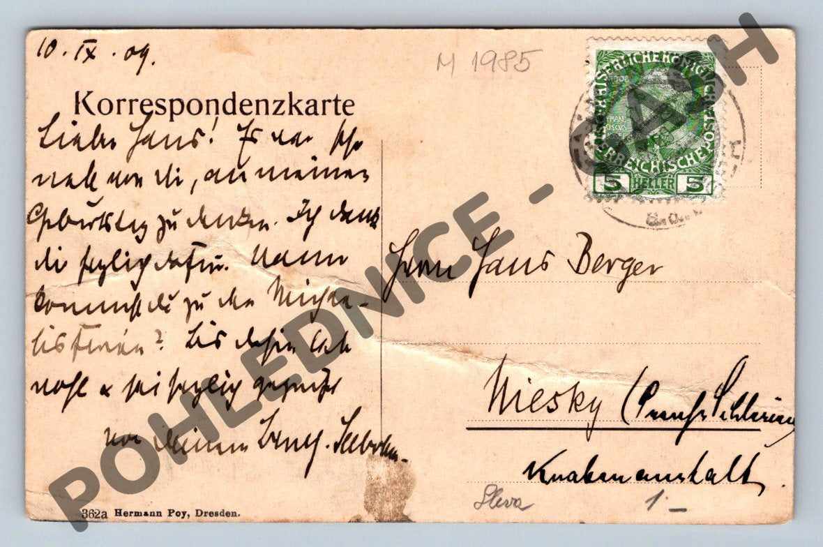 Starobylá pohlednice z období Rakouska-Uherska, zobrazující Franzensbad (Františkovy Lázně) – Kaiserstraße. Pohlednice má krásný černobílý motiv lázeňského města s promenádou lemovanou stromy, kde se procházejí dobově odění lidé. Na zadní straně je ručně psaný text, německý popis, adresa a rakouskouherská známka v nominální hodnotě 5 heller. Pohlednice je ve sběratelském stavu, s drobnými známkami stáří, vhodná pro sběratele historických pohlednic či zájemce o české lázeňské město a jeho minulost. Vydavatel: Hermann Poy, Dresden. Vzácný doklad doby před rokem 1950.