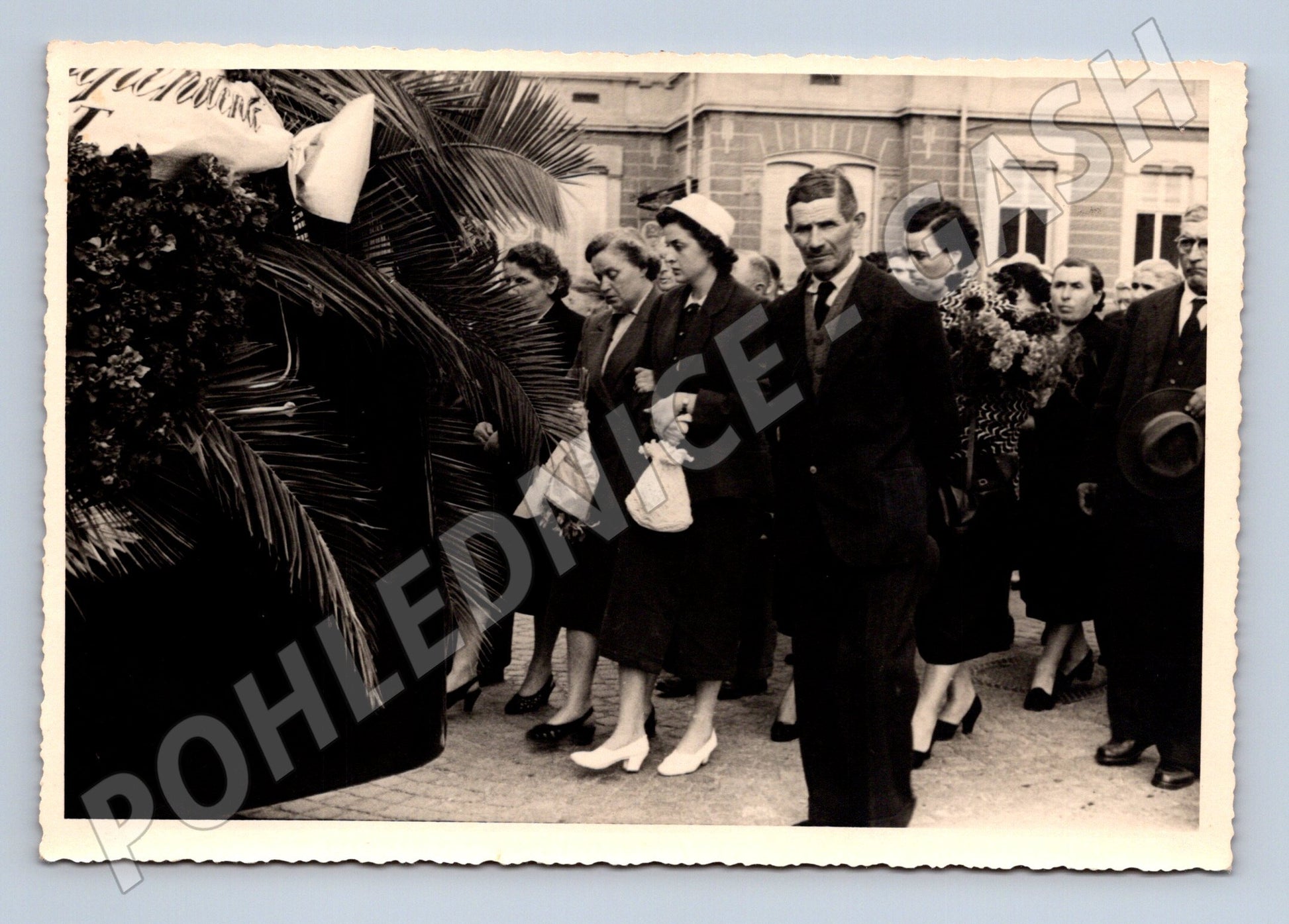 Nabízím originální černobílou pohlednici menšího formátu, zachycující smuteční průvod nebo pohřeb v Československu před rokem 1950. Na snímku je několik osob oblečených ve smutečním oděvu, v pozadí je vidět budova a část věnce. Stav pohlednice je velmi dobrý, bez zásadního poškození, pouze drobné známky stáří na hranách. Zadní strana je čistá, bez popisu, pouze s evidenčním číslem. Pohlednice je vhodná pro sběratele historických fotografií a pohlednic z období první poloviny 20. století.