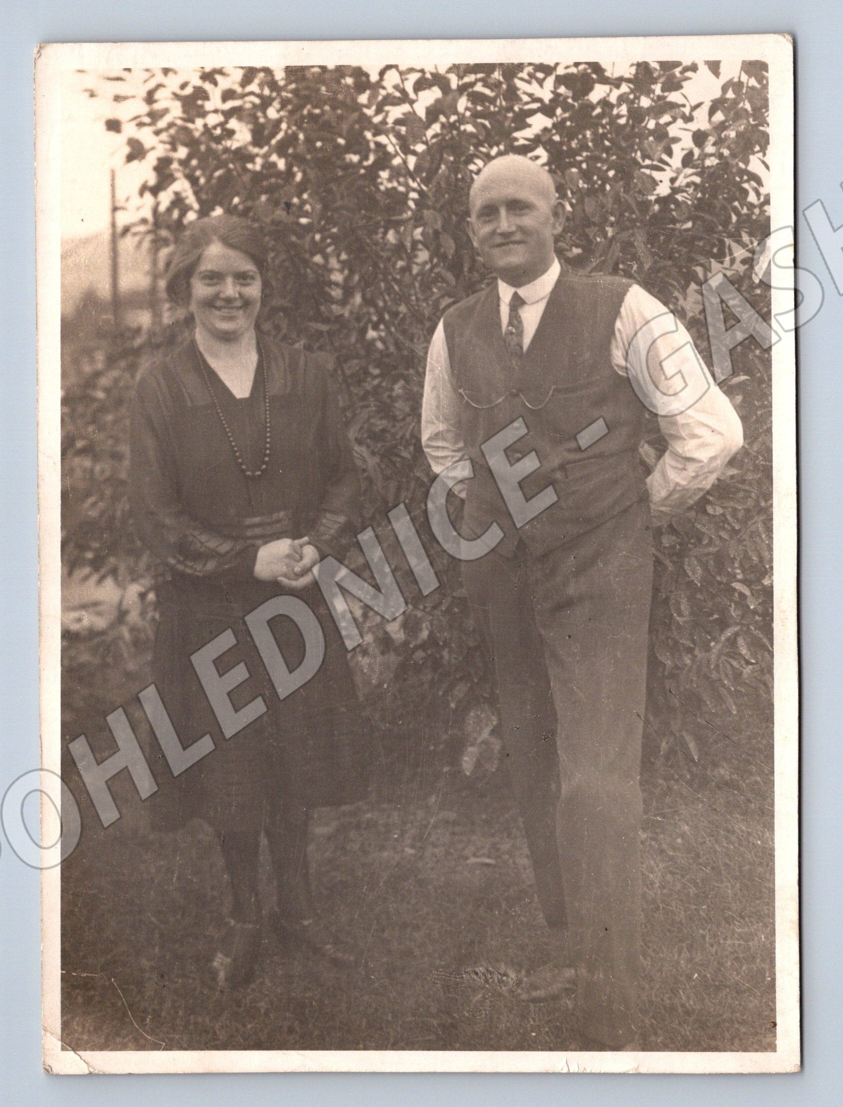 Originální stará černobílá pohlednice zachycující portrét muže a ženy ve venkovském prostředí. Pohlednice je v klasickém malém formátu, typickém pro období první poloviny 20. století. Na přední straně je patrné mírné poškození rohů, drobné škrábance a známky stárnutí. Zadní strana je čistá, pouze s ručně psaným číslem. Tato pohlednice je vhodná pro sběratele historických fotografií a pohlednic s tématikou osobností či rodinných portrétů. Výborný doplněk do sbírky dobových artefaktů, dokumentující atmosféru a módu daného období.