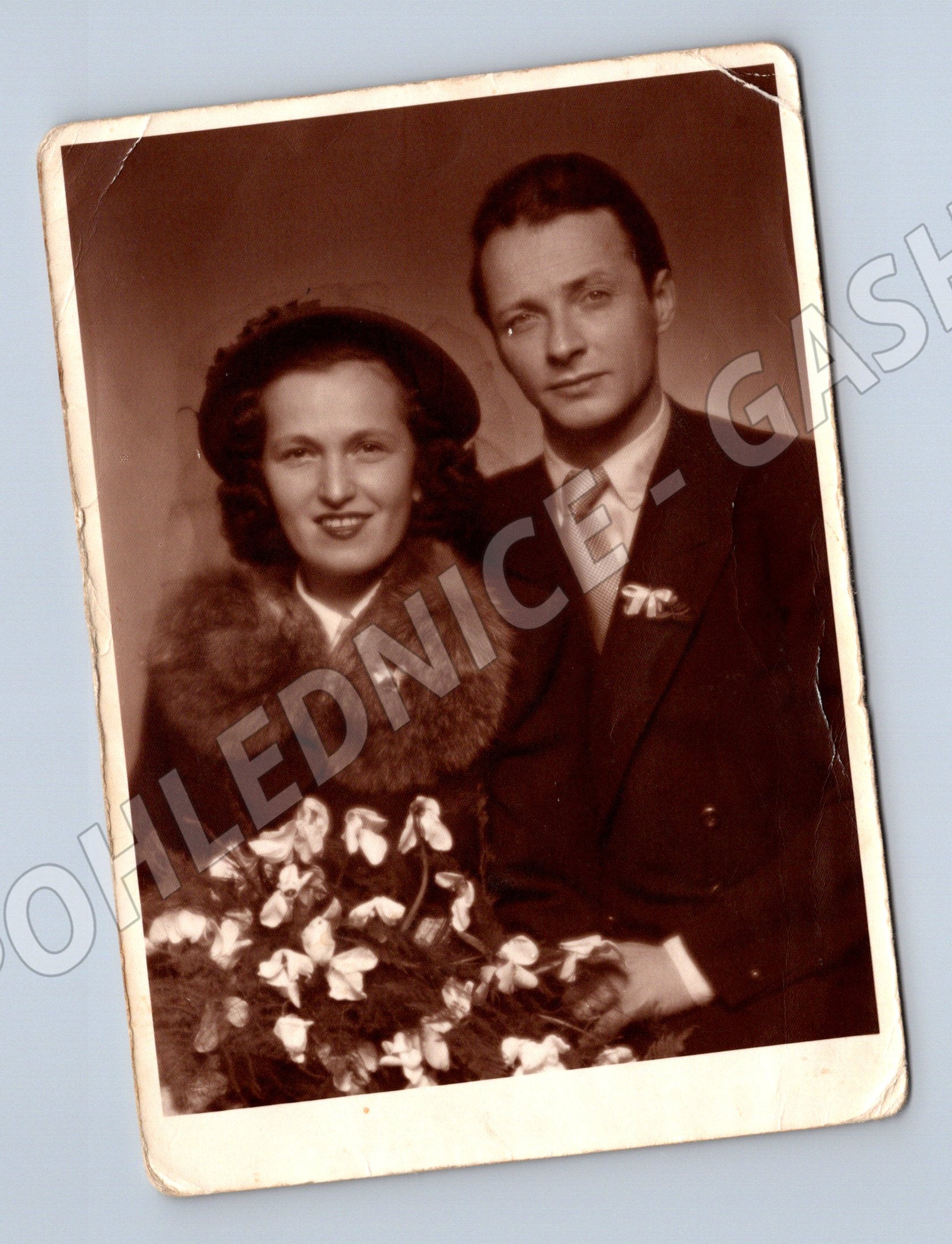 Originální stará černobílá pohlednice s portrétem muže a ženy. Pohlednice je ve stylu první poloviny 20. století, pravděpodobně svatební nebo společenský portrét. Žena má elegantní účes a límec z kožešiny, muž je v obleku s kravatou. Karta nese známky stáří, mírné ohyby a zašpinění, což přidává na její autenticitě. Zadní strana je opotřebovaná, popsaná číslem a razítkem. Výborný exemplář pro sběratele historických portrétních pohlednic.