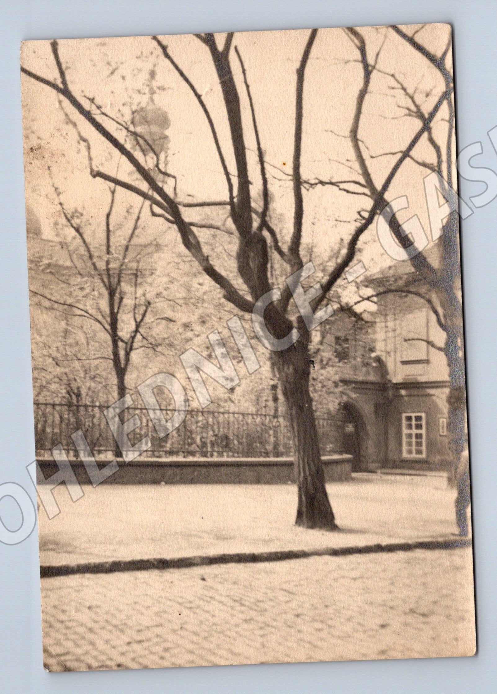 Starší černobílá pohlednice s motivem zimní krajiny s výrazným stromem v popředí a domkem na pozadí. Pravděpodobně pochází z období první poloviny 20. století. Pohlednice nese známky stáří, na zadní straně je ručně psaná tužkou číslice a krátký nápis. Rozměr odpovídá malému formátu používanému do roku 1950. Stav odpovídá stáří – pohlednice je lehce zašlá, rohy mírně opotřebované. Vhodné pro sběratele historických pohlednic z ČR.