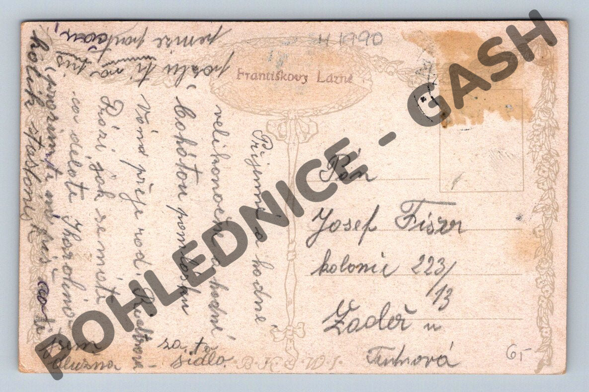 Historická pohlednice z období Rakousko-Uherska, z malého formátu před rokem 1950. Na přední straně je kolorovaná kresba lázeňské promenády pravděpodobně ve Františkových Lázních, kde jsou zachyceny dámy a páni v dobovém oblečení při procházce parčíkem s altánkem a bohatou zelení v pozadí. Ručně psaná korespondence na zadní straně, dopisováno, známka chybí. Originální stav, lehké známky stáří a opotřebení (patina, drobné skvrnky). Pohlednice je vhodná pro sběratele historických pohlednic, regionální historie nebo milovníky lázeňské atmosféry.