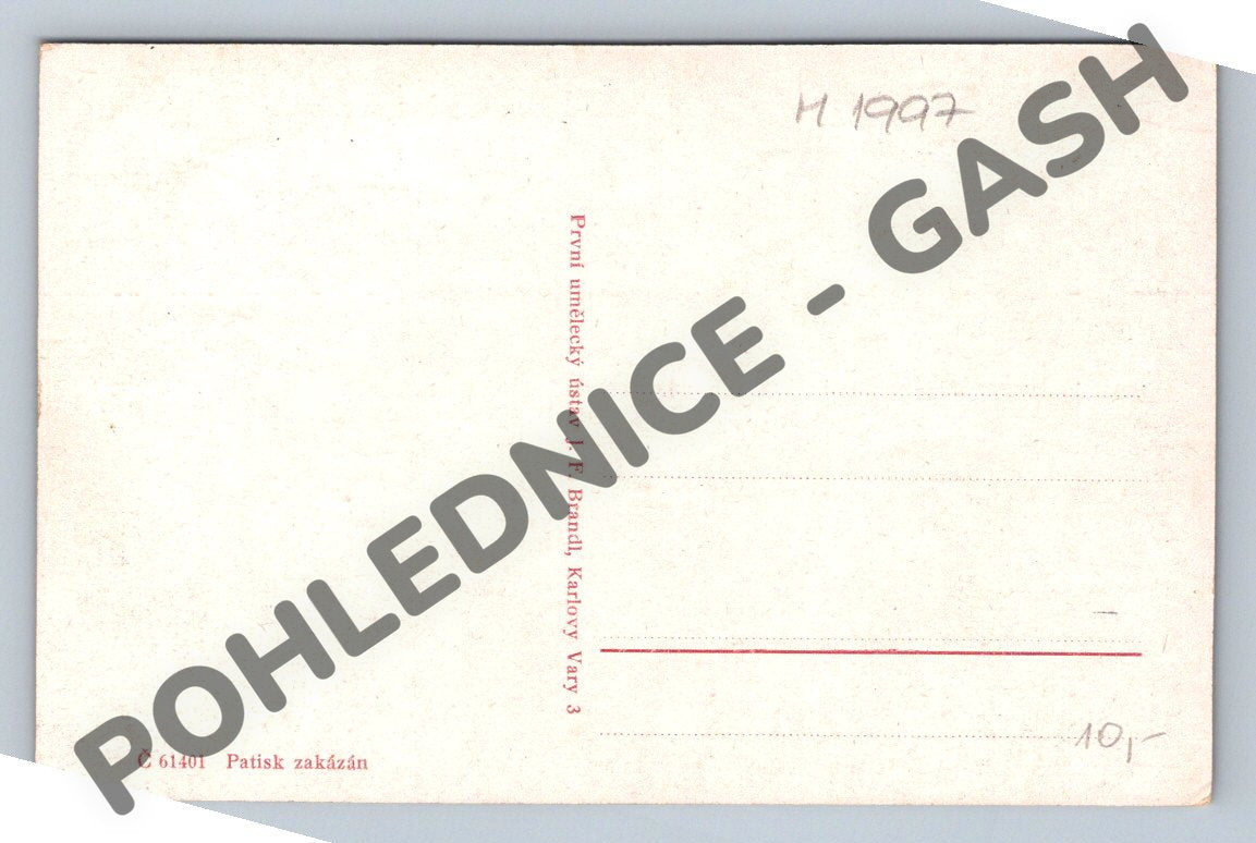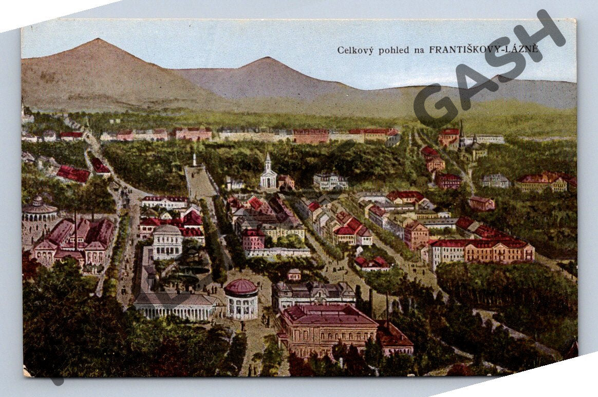 Starší pohlednice s názvem Celkový pohled na Františkovy Lázně nabízí působivý letecký pohled na toto známé lázeňské město v České republice. Jedná se o malý formát vydaný pravděpodobně první polovině 20. století (před rokem 1950). Na přední straně je barevná litografie se znázorněním města, prominentní budovy, lázeňské domy a okolní krajina s horami v pozadí. Zadní strana je nepopsaná, u okraje informace o vydavateli (První umělecký ústav J. F. Brandl, Karlovy Vary). Výborně zachovalý sběratelský kus vhodný do sbírek historických pohlednic českých měst.