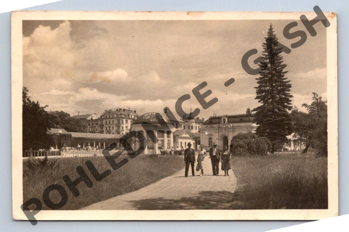 Originální historická pohlednice z Františkových Lázní, konkrétně náměstí Míru. Pohlednice zachycuje secesní kolonádu a lázeňské budovy s promenádou, po které kráčí několik elegantně oblečených postav. Na rubu je ručně psaný text a poštovní razítko z Františkových Lázní. Pohlednice nese známky stáří, místy je patrné opotřebení a mírné zašpinění, což dokládá její původní charakter. Vhodný sběratelský kus pro milovníky české historie a lázeňské architektury. Velmi pěkný stav vzhledem ke stáří, originál do roku 1950.