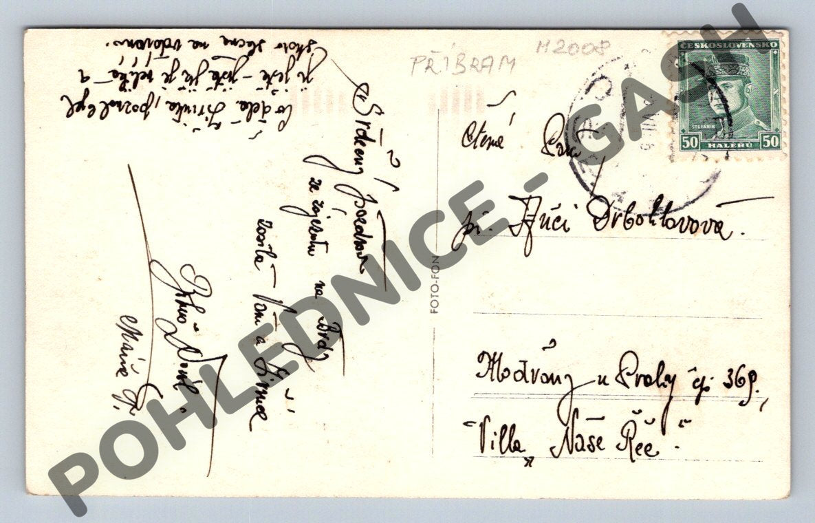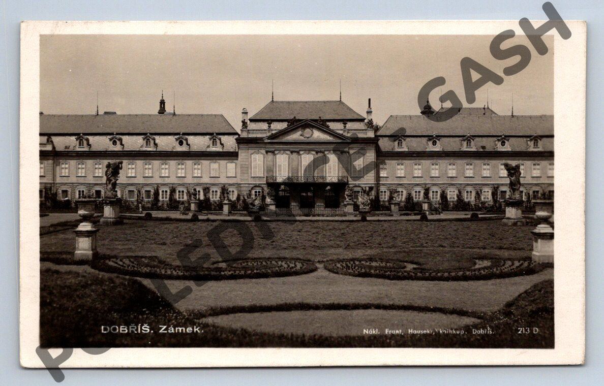 Originální černobílá pohlednice s motivem zámku Dobříš. Na přední straně je krásné vyobrazení barokního zámku s upraveným francouzským parkem a sochami. Pohlednice pochází z období první poloviny 20. století, je prošlá poštou, opatřená dobovou známkou Československo a jasným razítkem. Na zadní straně je ručně psaný text adresovaný do obce Hlubočepy u Prahy. Pohlednice je ve sběratelsky atraktivním stavu, drobné opotřebení odpovídá stáří. Krásný přírůstek do sbírky historických pohlednic zámků České republiky.