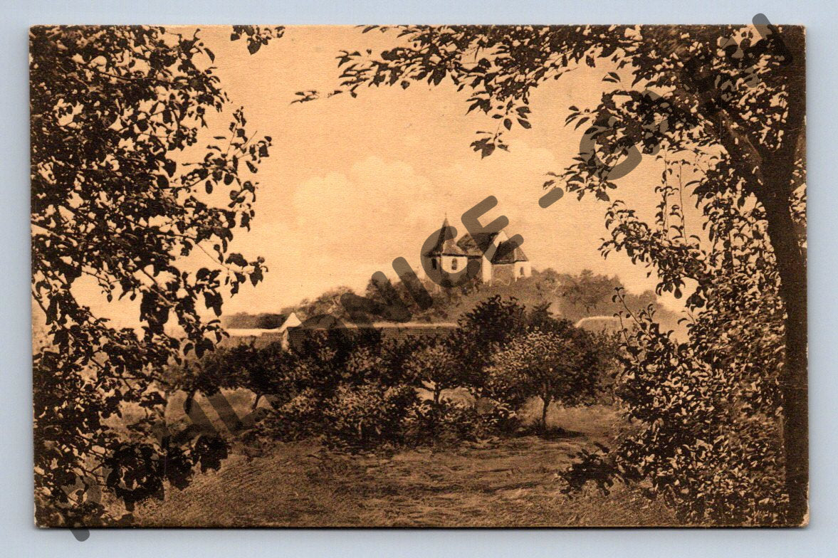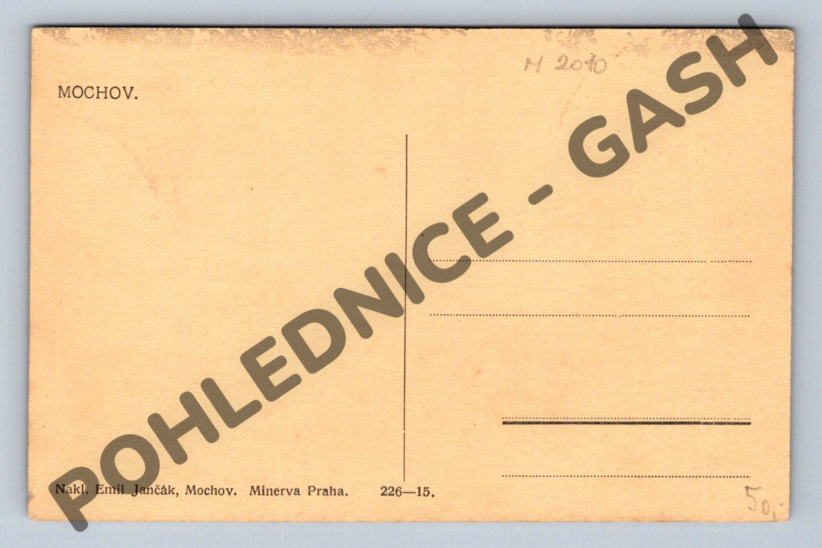 Originální historická pohlednice s motivem obce Mochov v Čechách, vydaná nakladatelstvím Emil Jančák, Mochov, Minerva Praha. Pohlednice zachycuje malebný pohled na kostel a okolní krajinu, orámovanou větvemi stromů v popředí. Typické zpracování a tónování předválečných pohlednic. Stav viz foto, mírné opotřebení odpovídající stáří. Zadní strana neprošlá poštou, čistá a nepopsaná, vhodná i pro sběratele regionálních motivů.