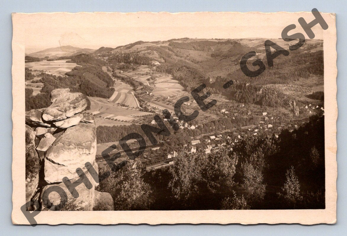 Originální stará pohlednice s názvem Malá Skála, Vranov (německy Klein-Skal, Wranow), zobrazující malebnou krajinu s výraznými skalními útvary a výhledem na obec Malá Skála v Českém ráji. Pohlednice je v klasickém malém formátu, pravděpodobně z období první poloviny 20. století (před rokem 1950). Na fotografii lze vidět unikátní skalní struktury, hluboké lesy a panoramatický pohled do údolí s roztroušenými domy a typickou českou venkovskou krajinou. Rub pohlednice obsahuje základní popis v češtině a němčině, nechybí ani předtištěné linky na adresu. Jedná se o autentický sběratelský kousek vhodný pro milovníky historie, regionálních reálií a starých pohlednic.