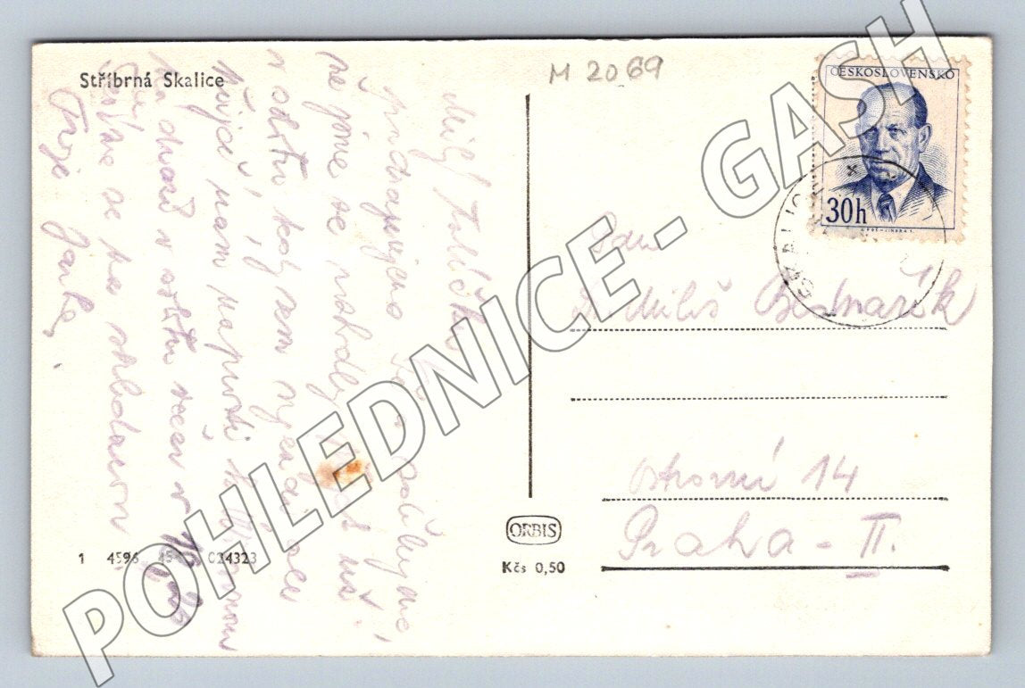 Originální stará pohlednice městyse Stříbrná Skalice. Na přední straně je vyobrazeno malebné náměstí s radnicí a okolními domy, typická atmosféra menšího středočeského městečka. Pohlednice byla odeslána, text a známka na zadní straně – známka 30h s portrétem, razítko. Vydal Orbis, cena 0,50 Kčs, číslování 4595-C24323. Jedná se o pohlednici menšího formátu, typickou pro období před rokem 1950. Stav odpovídá stáří, viz foto.
