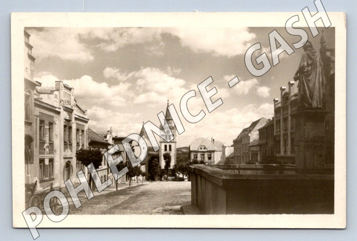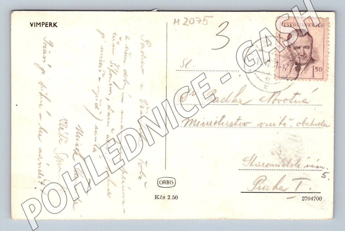 Originální černobílá pohlednice města Vimperk, na které je vyobrazena historická část města s radniční věží a sochou v popředí. Jedná se o malý formát pohlednice (do roku 1950) vydaný nakladatelstvím Orbis, s cenou 2,50 Kčs. Pohlednice byla skutečně prošlá poštou, což dokládá známka s portrétem prezidenta Edvarda Beneše a ručně psaný text adresovaný do Prahy. Celkově je pohlednice ve velmi pěkném stavu a představuje zajímavý sběratelský kousek z období první poloviny 20. století.