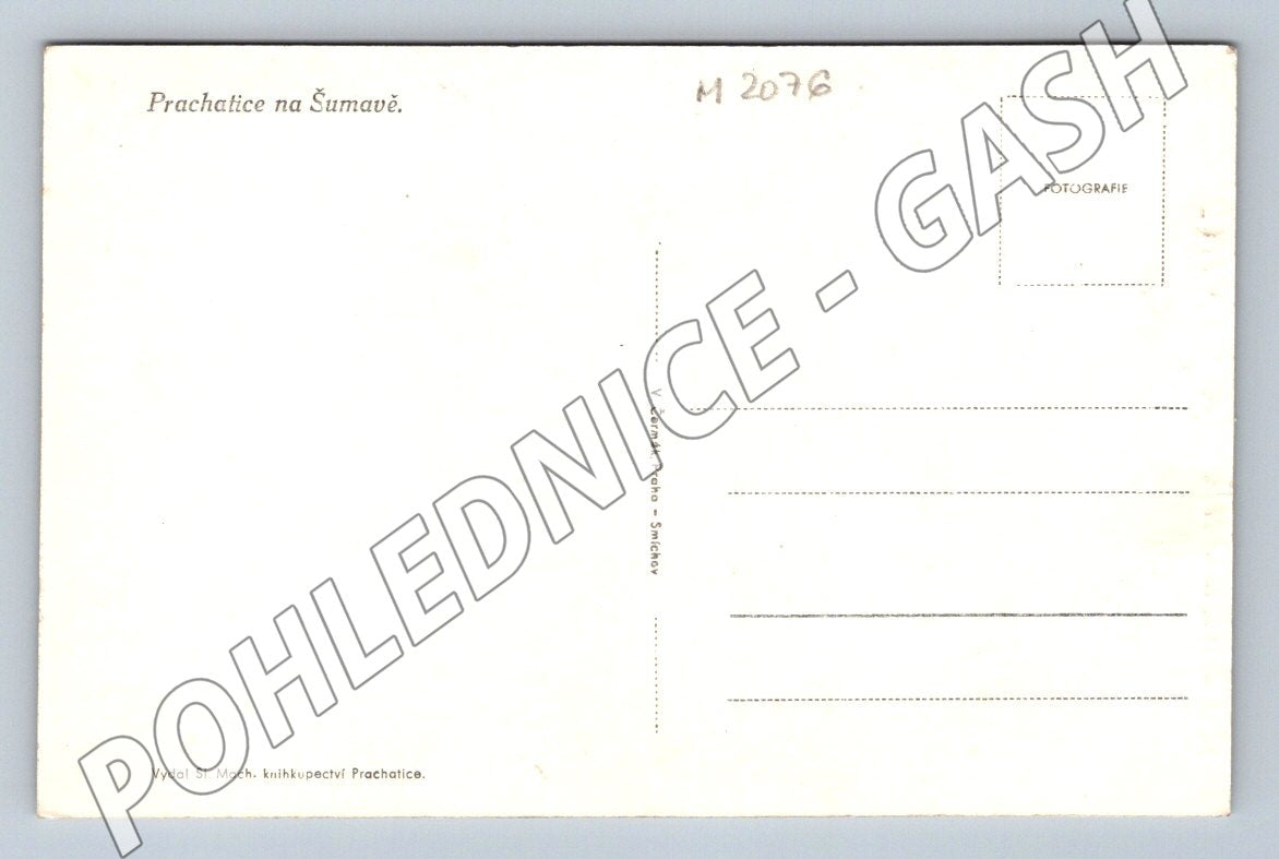 Starý černobílý pohled na město Prachatice na Šumavě, vydaný knihkupectvím v Prachaticích. Na pohlednici je zobrazeno panorama města s kostelem a okolní krajinou. Vlevo svisle nápis ROZHLEDNA NA LIBÍNĚ . Neprošlá poštou, velmi dobrý sběratelský stav. Ideální pro sběratele historických pohlednic z Čech a Šumavy.
