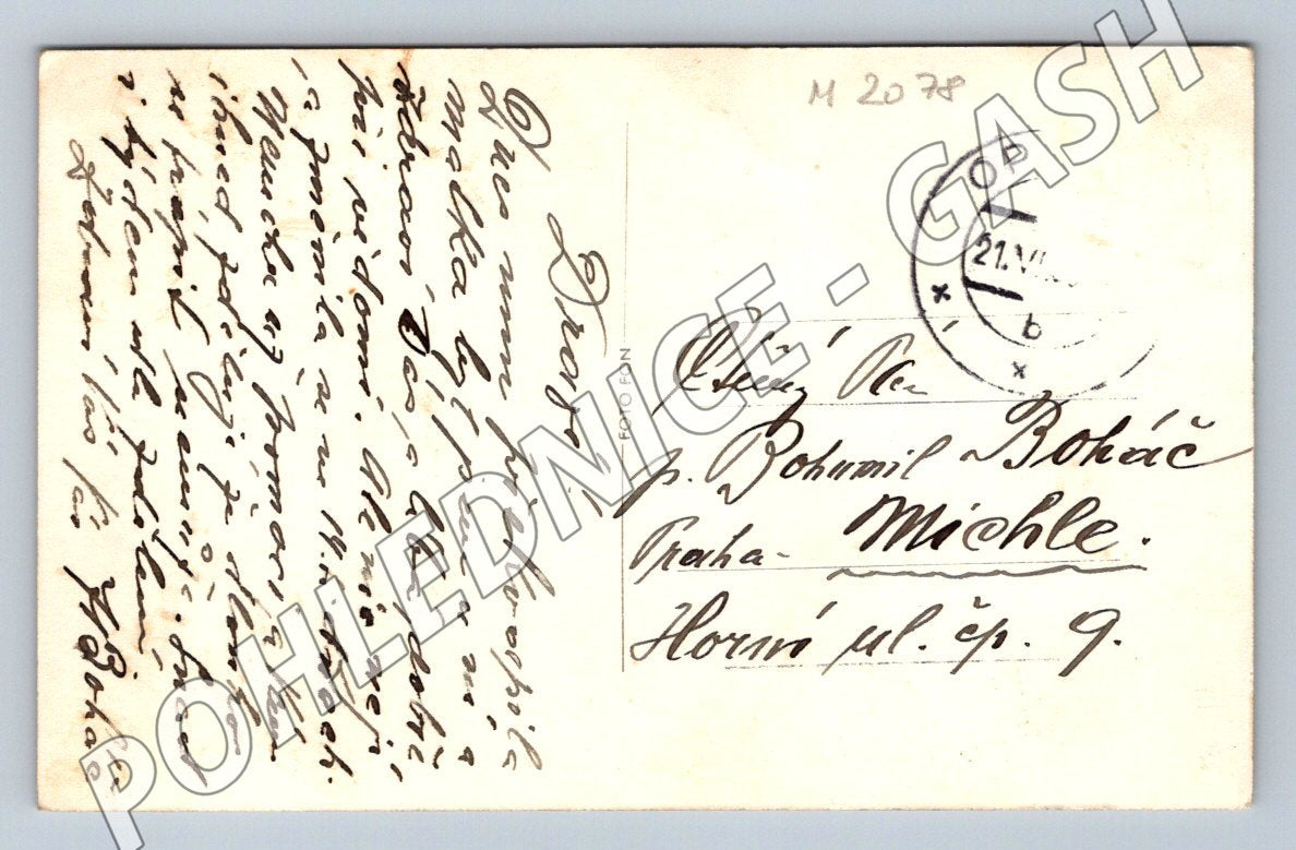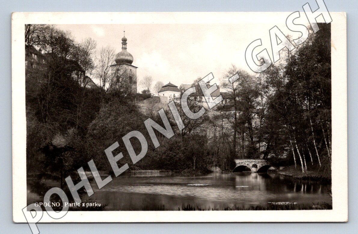 Starší černobílá pohlednice s motivem zámku Opočno, zobrazující pohled na zámek z parku s rybníkem a kamenným mostkem na předním plánu. Na zadní straně je ručně psaný text a adresa, pohlednice prošla poštou včetně razítka s datem. Zachovalost viz foto, pohlednice může vykazovat drobné známky stáří. Výborný sběratelský kousek pro milovníky českých památek a historických pohlednic.