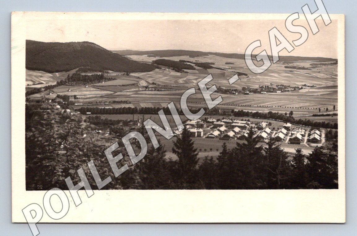 Historická pohlednice – pohled na vesnici a krajinu, ČR, razítkovaná