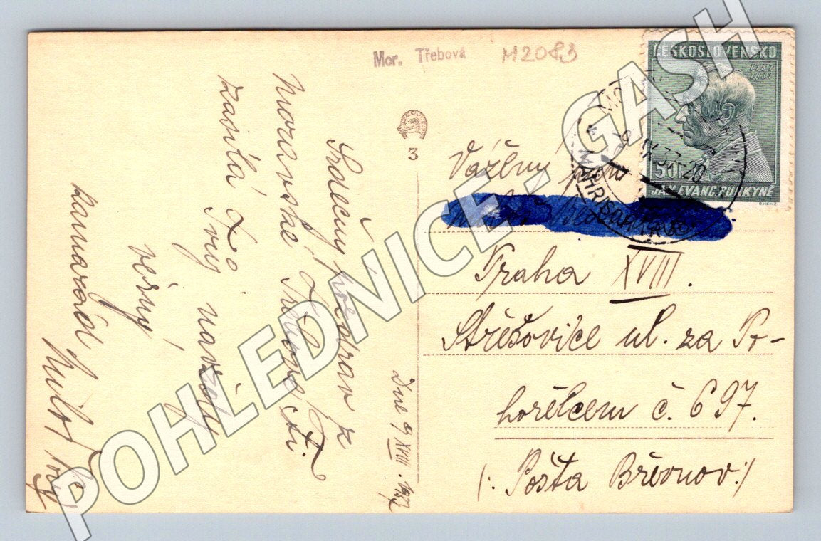 Historická pohlednice s černobílou fotografií, zobrazující pohled na vesnickou krajinu, na pozadí lesy a rozlehlá pole. Pohlednice byla odeslána poštou a je opatřena známkou Československo s portrétem J. E. Purkyně, v hodnotě 50h. Na zadní straně je ručně psaný text a adresát včetně razítka. Pohlednice je v dobrém sběratelském stavu, nese známky běžného opotřebení a stáří. Skvělý kousek do sbírky historických pohlednic z Česka, vhodné pro milovníky venkovské krajiny a regionální historie.