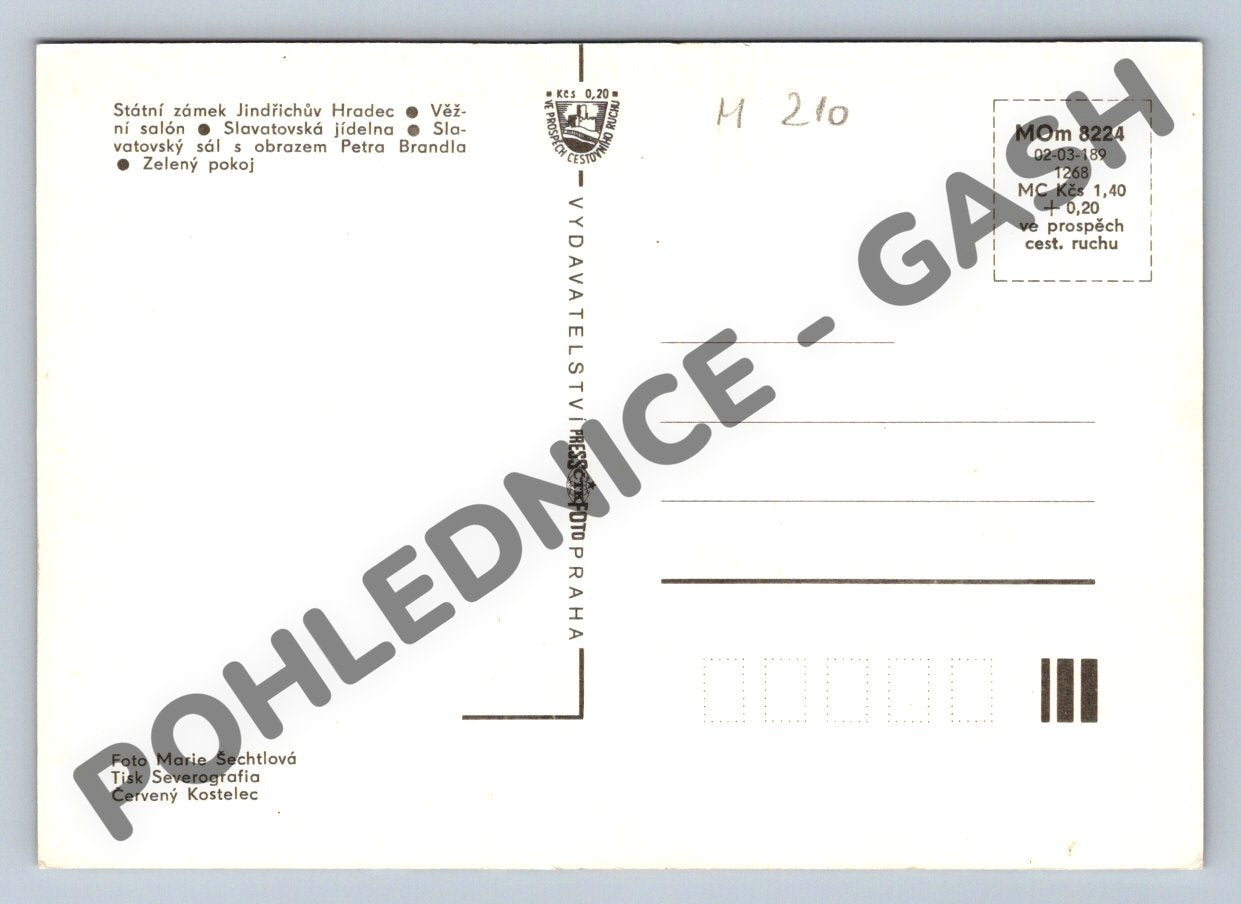 Originální pohlednice s motivem zámku Jindřichův Hradec. Na přední straně je koláž fotografií, která zachycuje nejen impozantní exteriér zámku od vodní hladiny, ale i nádherně zdobené interiérové místnosti včetně věžního a Slavatoského salónu a Zeleného pokoje. Zadní strana je nepopsaná, najdete zde informace o vydavatelství a popis jednotlivých místností zámku. Tisk Severografia, foto Marie Šechtlová. Skvělý sběratelský kousek pro milovníky hradů a zámků nebo historických památek Československa.