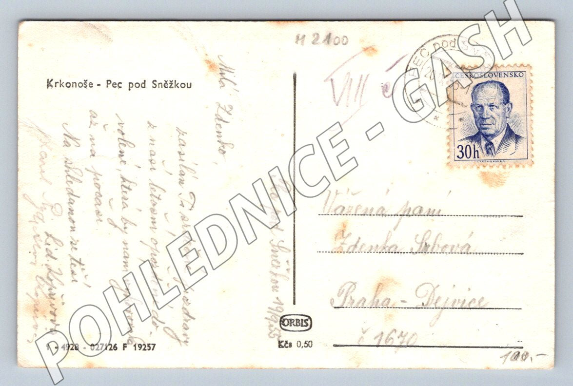 Originální stará pohlednice s motivem horské vesničky Pec pod Sněžkou v Krkonoších. Na pohlednici je krásný panoramatický pohled na roztroušené chalupy na loukách s lesy a horami v pozadí. Jedná se o černobílou pohlednici menšího formátu zaslanou poštou. Na zadní straně je rukou psané věnování, známka ČSR a razítko Pec pod Sněžkou . Výborný sběratelský stav, pohlednice vhodná do sbírky historických pohlednic z českých hor či Krkonoš.