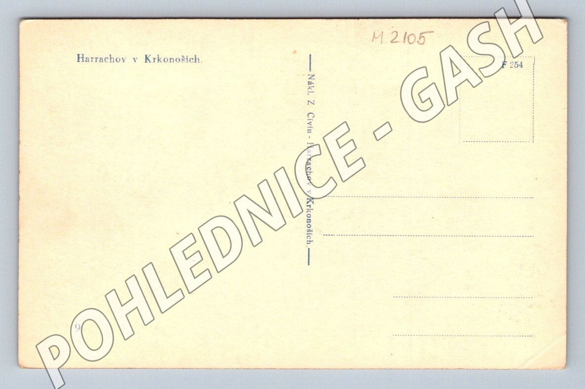 Originální stará pohlednice s názvem Harrachov v Krkonoších . Pohlednice zachycuje zimní zasněženou krajinu města Harrachov, obklopeného lesy, s viditelnými budovami a zasněženými cestami. Jedná se o malý formát pohlednice vydané nakladatelstvím Cwyn, Harrachov v Krkonoších. Pohlednice je neprošlá poštou, stav viz foto. Skvělý sběratelský kousek zachycující atmosféru krkonošské obce v první polovině 20. století.