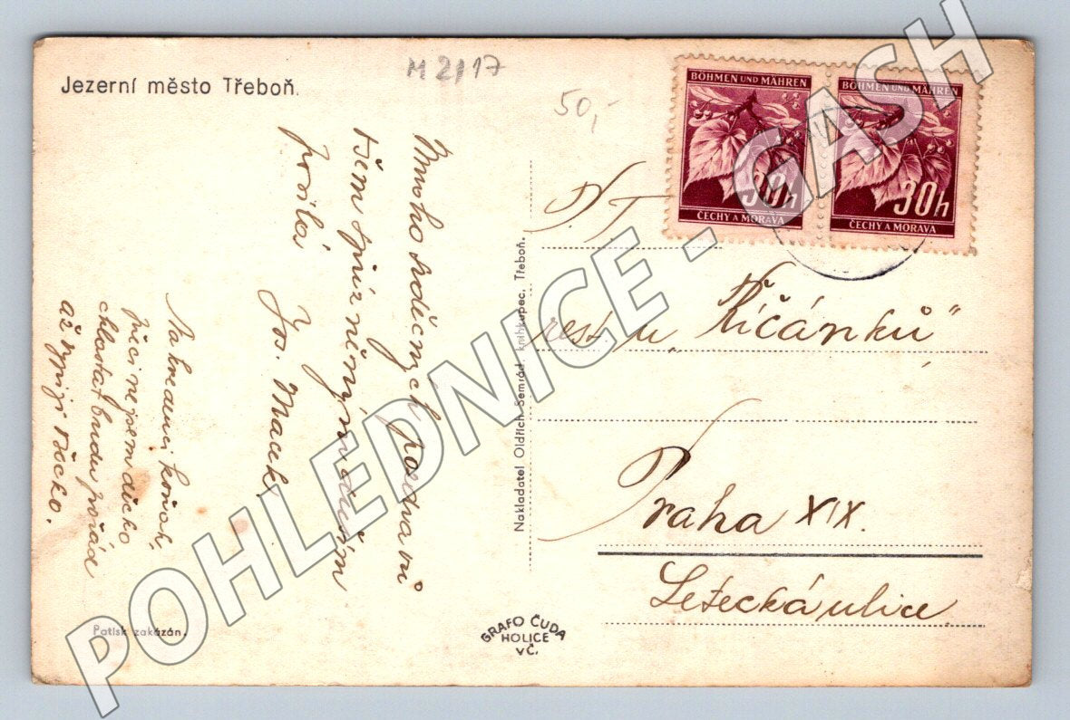 Starší černobílá pohlednice Jezerní město Třeboň zachycující loď se dvěma osobami na klidné vodní hladině. Na zadní straně je ručně psaný text, adresa a dvě poštovní známky z období Protektorátu Čechy a Morava (30 h, motiv lípy). Vydavatel: Oldřich Šmíd, Třeboň. Pohlednice je prošlá poštou, s jasně čitelnými známkami a razítkem. Hezký sběratelský stav, minimální známky opotřebení odpovídající stáří.