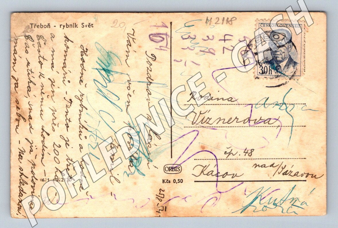 Originální stará pohlednice s vyobrazením rybníku Svět v Třeboni. Pohlednice je černobílá, na přední straně je atmosférická fotografie se stromy kolem břehů a vodní plochou v popředí. Zadní strana obsahuje ručně psaný text, adresu, známku a poštovní razítko ČSR. Pohlednice nese známky stáří a používání – rohy jsou lehce opotřebené, je vidět zašpinění a skvrny, ale jedná se o pěkný sběratelský kus vhodný do sbírky historických pohlednic z České republiky. Formát odpovídá menšímu rozměru, typickému pro období do roku 1950.
