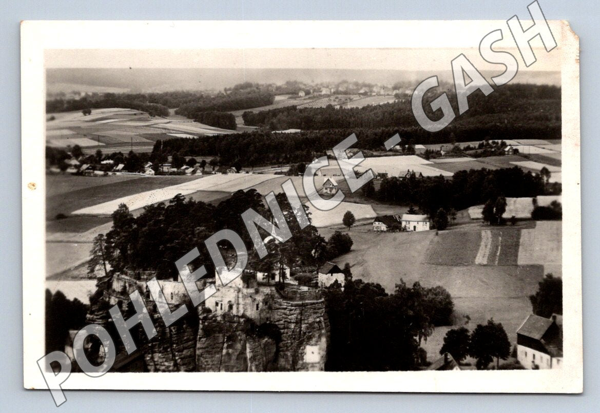 Originální stará pohlednice znázorňující pohled na hrad Sloup v Čechách a okolní krajinu. Černobílý snímek zachycuje hrad vystavěný na pískovcové skále uprostřed malebné vesnické krajiny s polemi, loukami a roztroušenými domky. Zadní strana je nepopsaná, s uvedením názvu SLOUP v Čechách , číslem tisku FP954 a vydavatelem ORBIS. Pohlednice je ve sběratelském stavu, mírné stopy stáří a lehké zažloutnutí v rozích. Vhodné pro sběratele, milovníky historie a regionálních motivů.