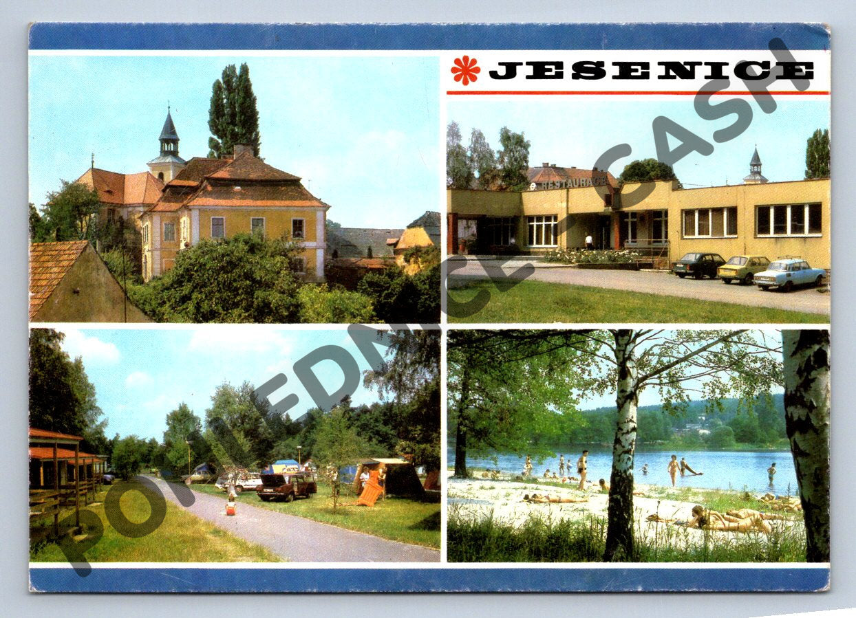 Originální pohlednice Jesenice, okres Rakovník, vydaná ve druhé polovině 20. století. Na přední straně jsou čtyři barevné fotografie zobrazující významné budovy, centrum města, rekreační oblast a koupaliště v okolí Jesenice. Zadní strana je nevyplněná a určená k poslání – obsahuje místo pro známku, adresu a krátkou zprávu. Jedná se o dobovou pohlednici ideální pro sběratele, milovníky regionální historie nebo jako dekorativní prvek s retro atmosférou. Pohlednice je ve velmi dobrém sběratelském stavu, s mírnými známkami stáří na okrajích. Výrobce: Panorama, foto: K. Líbal.