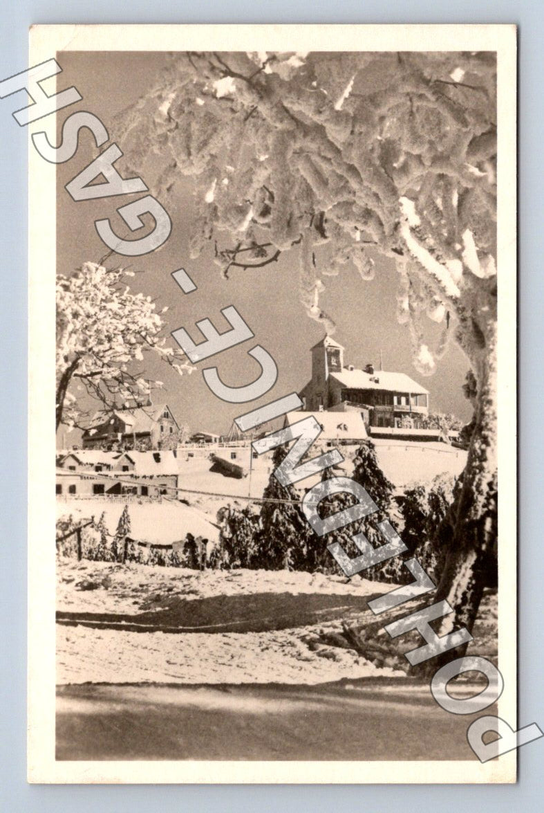 Originální černobílá pohlednice s motivem Komáří Vížka, zasněžené krajiny a horského hotelu. Pohlednice pochází z období první poloviny 20. století, odeslána byla v roce 1950, což dokládá razítko a dobová známka Československo. Na zadní straně je ručně psaný text i adresa, pohled byl doručen do Náchoda. Výrazný zimní motiv sněhem pokrytých stromů a budov je typickým příkladem tehdejší české pohlednicové tvorby. Velmi dobrý sběratelský stav, originální dobová korespondence i známka.