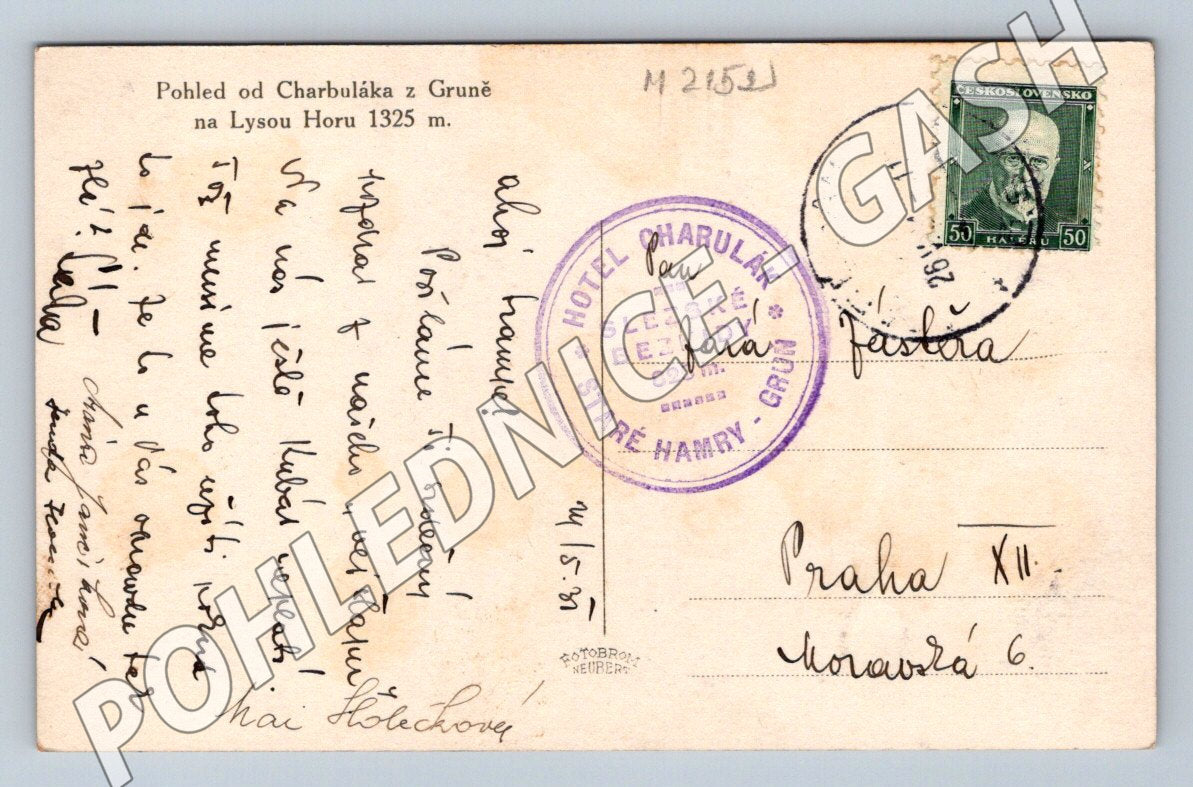 Originální stará pohlednice s názvem Pohled od Charbuláka z Gruně na Lysou Horu 1325 m zachycující nádhernou krajinu Moravskoslezských Beskyd. Pohlednice je ve velmi dobrém sběratelském stavu, vyfrankovaná známkou Československo a prošlá poštou s razítkem. Na zadní straně je rukopisný text a dobová poštovní razítka včetně kulatého razítka Hotel Charulák - Staré Hamry - Slezské Beskydy. Velmi krásný pohled na beskydskou krajinu a zajímavý sběratelský kousek z období první poloviny 20. století.