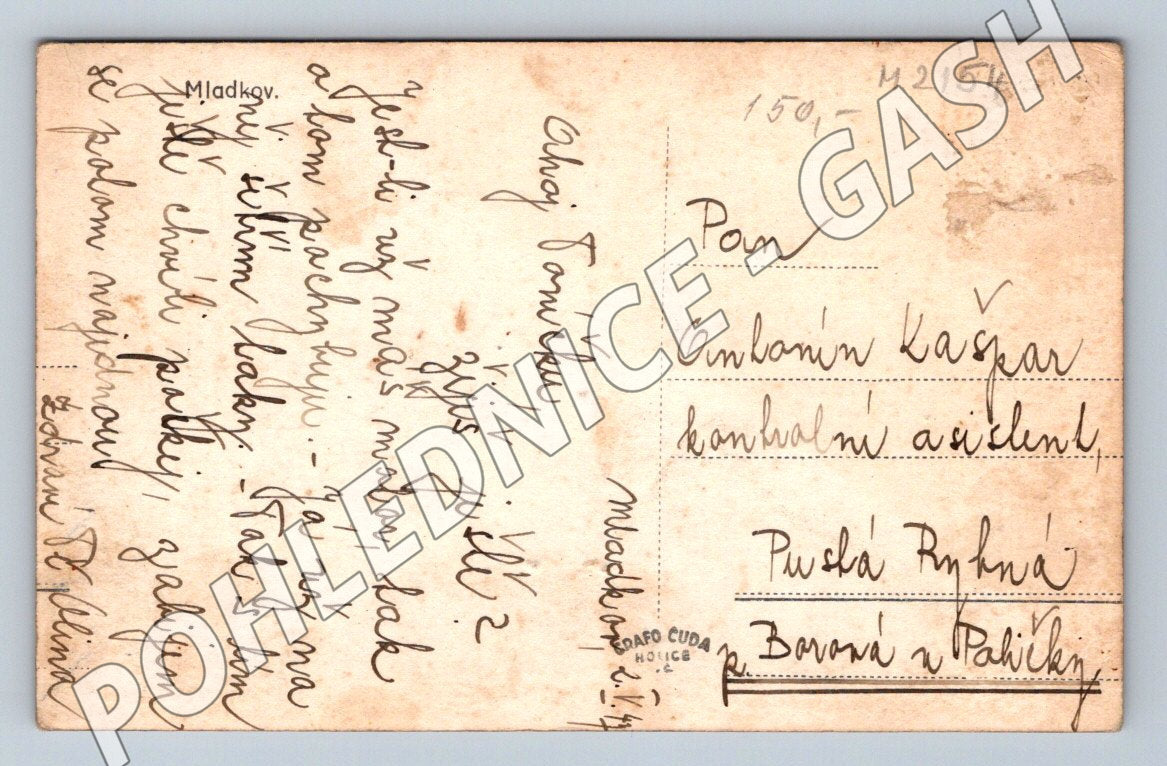 Originální stará pohlednice zobrazující panoráma české vesnice s kostelem, okolními poli a lesy, pravděpodobně z první poloviny 20. století. Pohlednice nese stopy stáří, na rubové straně je ručně psaný text, známky i adresát. Pohlednice pochází z období před rokem 1950 a je cenným dokladem tehdejšího života a architektury českého venkova. Vhodné pro sběratele historických pohlednic či zájemce o regionální historii. Stav viz foto.