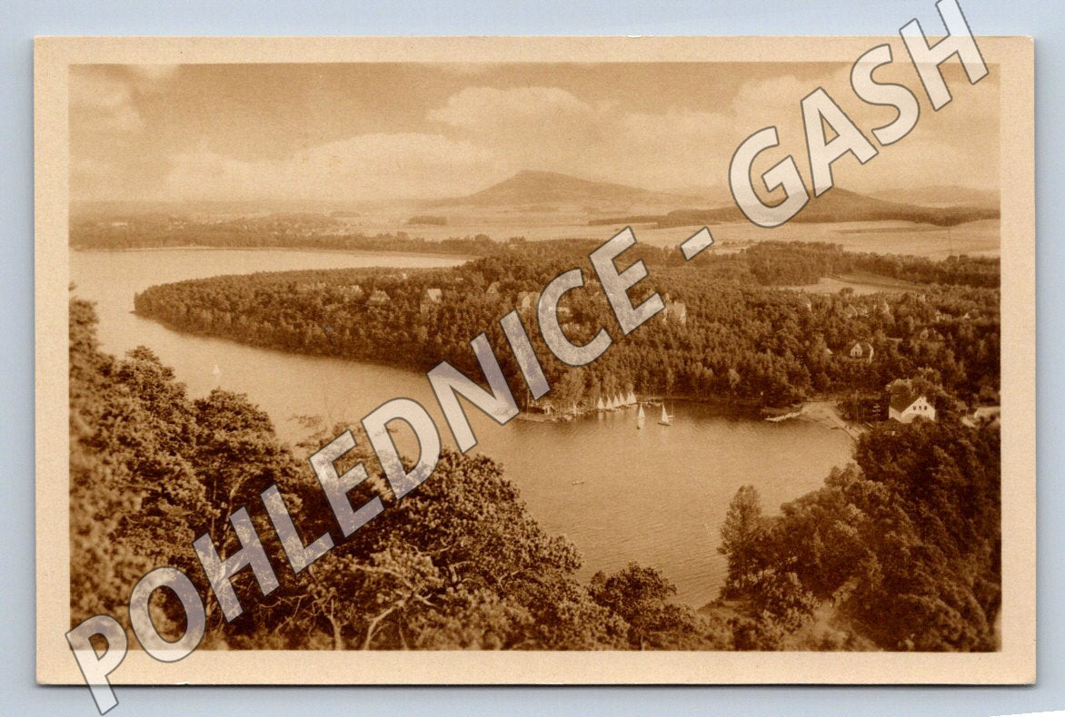 Originální stará pohlednice zobrazující letovisko Staré Splavy u Máchova jezera. Pohlednice je v černobílém provedení a zachycuje krásnou scenérii jezera obklopeného lesy s viditelnými plachetnicemi na hladině. Na zadní straně je předtištěný popis Letovisko Staré Splavy u Máchova jezera , místo pro známku a adresu, vydavatel ORBIS, cenová známka 2,50 Kčs. Pohlednice není prošlá poštou, je čistá. Jedná se o malý formát vydaný před rokem 1950, vhodné pro sběratele historických pohlednic s motivem české krajiny. Celkový stav velmi dobrý, bez viditelného poškození.