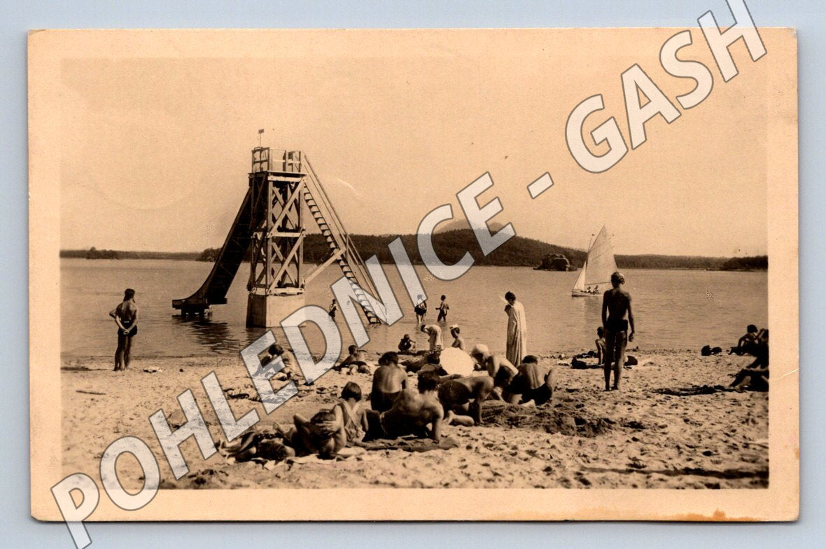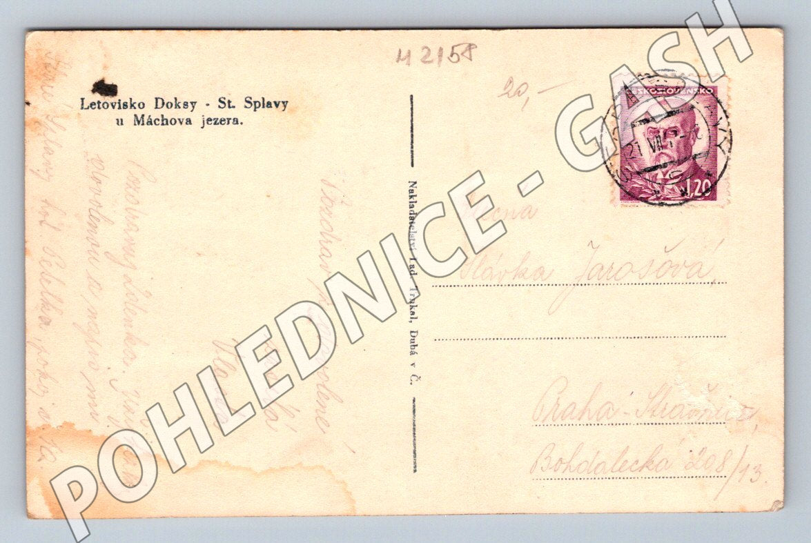 Starobylá černobílá pohlednice zachycující letovisko Doksy – Staré Splavy u Máchova jezera. Pohled na pláž s dřevěným tobogánem a koupajícími se lidmi, v pozadí jsou vidět lesy a plachetnice na jezeře. Rubová strana pohlednice je orazítkovaná a opatřená známkou ČSR, obsahuje ručně psaný text adresovaný slečně v Praze. Výborný dobový dokument rekreace první poloviny 20. století, vhodný pro sběratele, milovníky regionální historie či historie turismu. Stav viz foto, mírné známky stáří na okrajích, drobná patina a lehké zašpinění rožků. Malý formát do roku 1950.