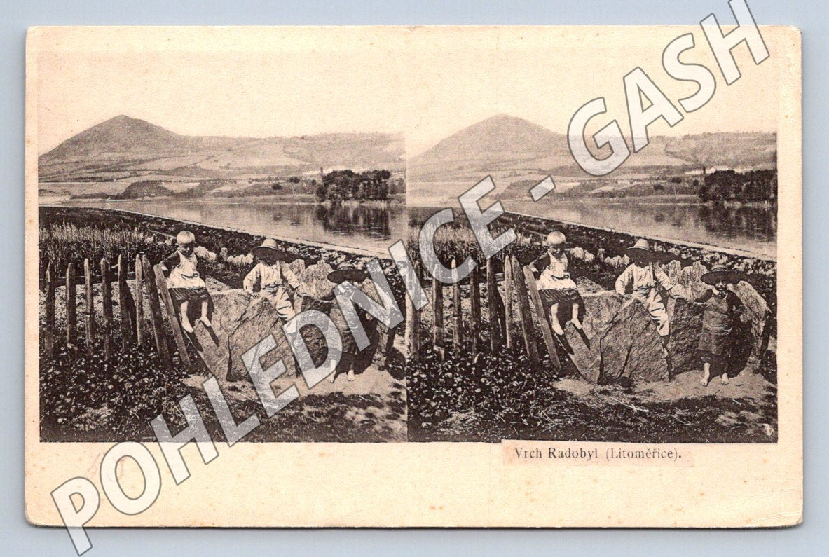 Originální stará stereoskopická pohlednice s motivem vrchu Radobýl u Litoměřic. Na přední straně je černobílý snímek krajiny s řekou, horou Radobýl a třemi dětmi v dobovém oblečení. Pohlednice je bez textu na zadní straně, zachovalá s drobnými známkami stáří. Vhodné pro sběratele historických pohlednic Českých zemí nebo milovníky regionálních motivů. Jedná se o malý formát, tisk před rokem 1950.
