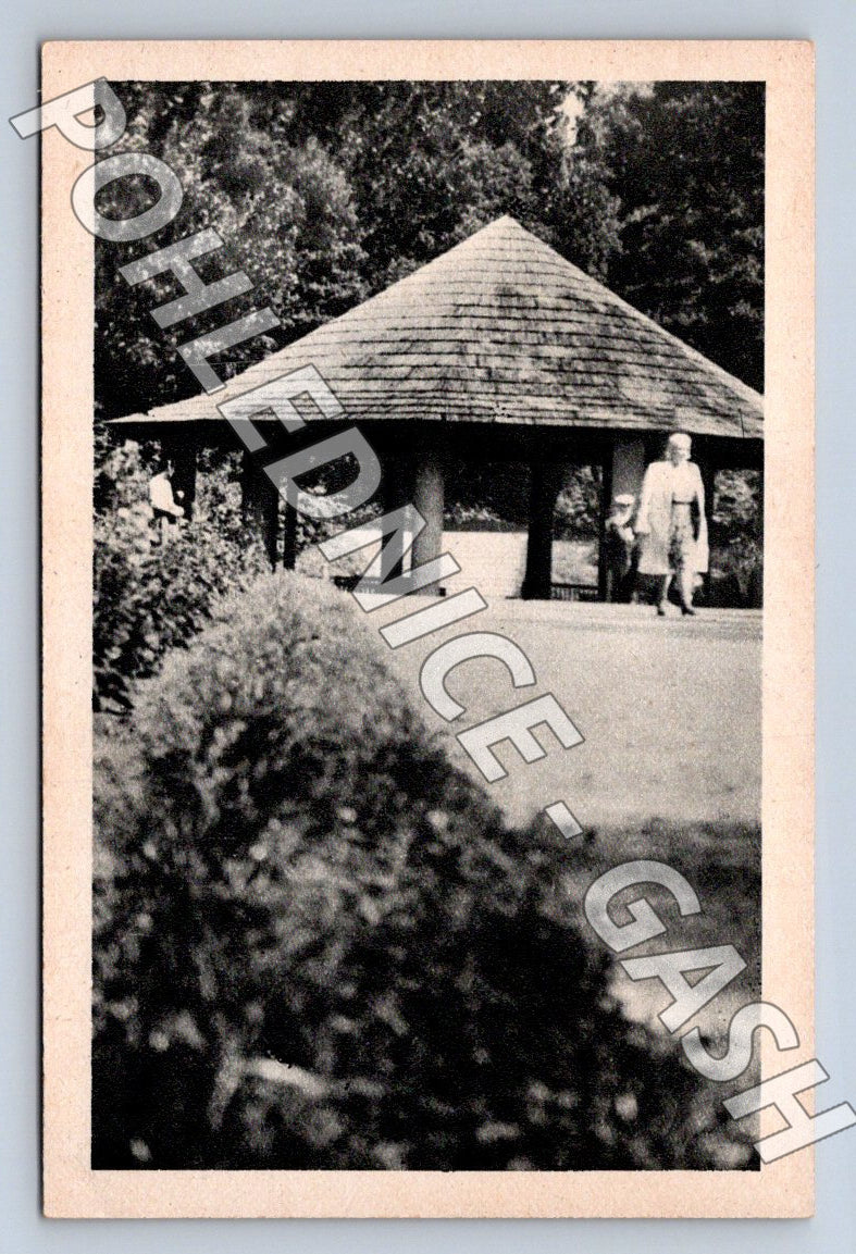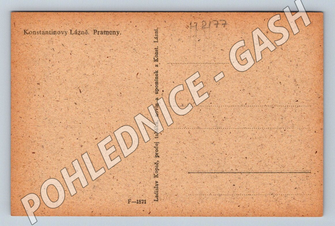 Originální černobílá pohlednice z období před rokem 1950 zachycující pramen v Konstantinových Lázních. Na přední straně pohlednice je vyobrazen altán u pramene s postavou uprostřed lázeňského parku, okolí lemují stromy. Na zadní straně nápis Konstantinovy Lázně. Prameny. Pohlednice je nepopsaná a nebyla odeslána, výborný stav pro sběratele i milovníky českých lázeňských lokalit. Vydal Ladislav Kopač, značení F-1871. Papír nese známky stáří, ale pohlednice je celkově velmi dobře zachovaná.