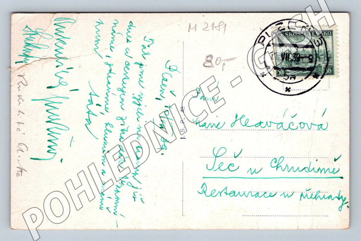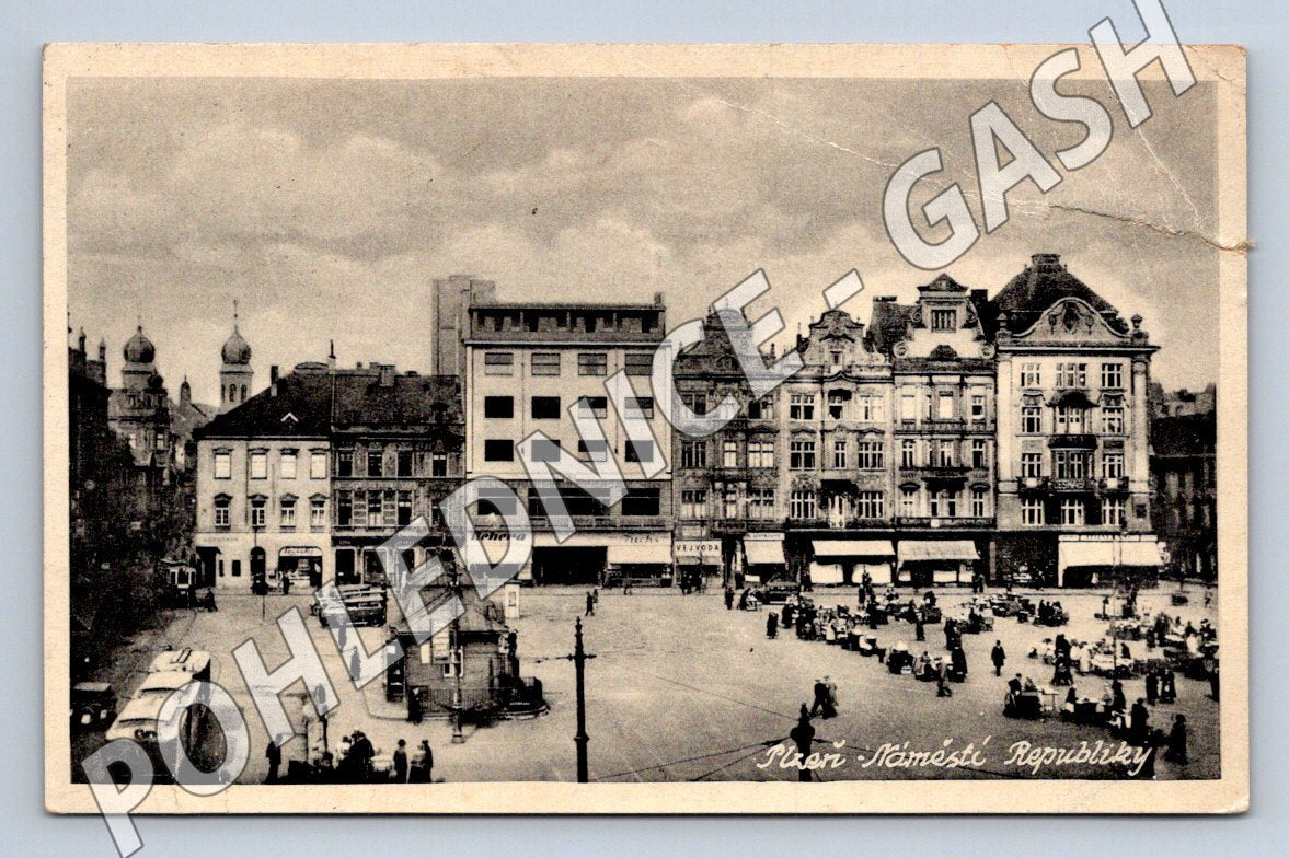 Originální stará pohlednice zachycující historické náměstí Republiky v Plzni. Černobílý snímek ukazuje náměstí s dobovou architekturou a rušným městským životem. Na pohlednici jsou krásně vidět městské domy, náměstí plné lidí, tržiště a také některá historická auta a tramvaje. Pohlednice je prošlá poštou, opatřena dobovou známkou a razítkem z 30. let 20. století. Na zadní straně rukou psaná zpráva adresovaná paní Marii Hlaváčové do Seče u Chrudimi. Stav pohlednice odpovídá stáří, v rozích drobné známky opotřebení, v horní části je patrná slabá rýha. Výjimečný sběratelský kus z období první republiky.