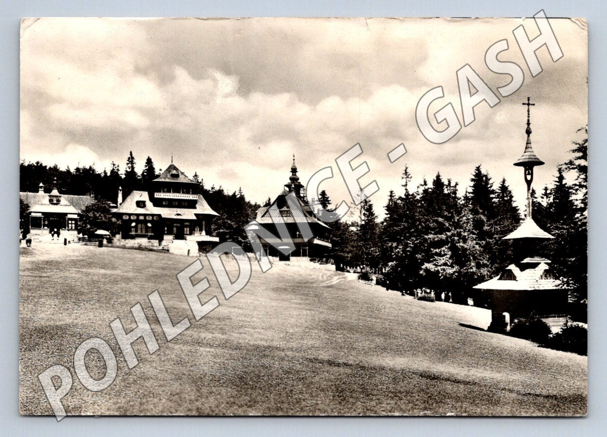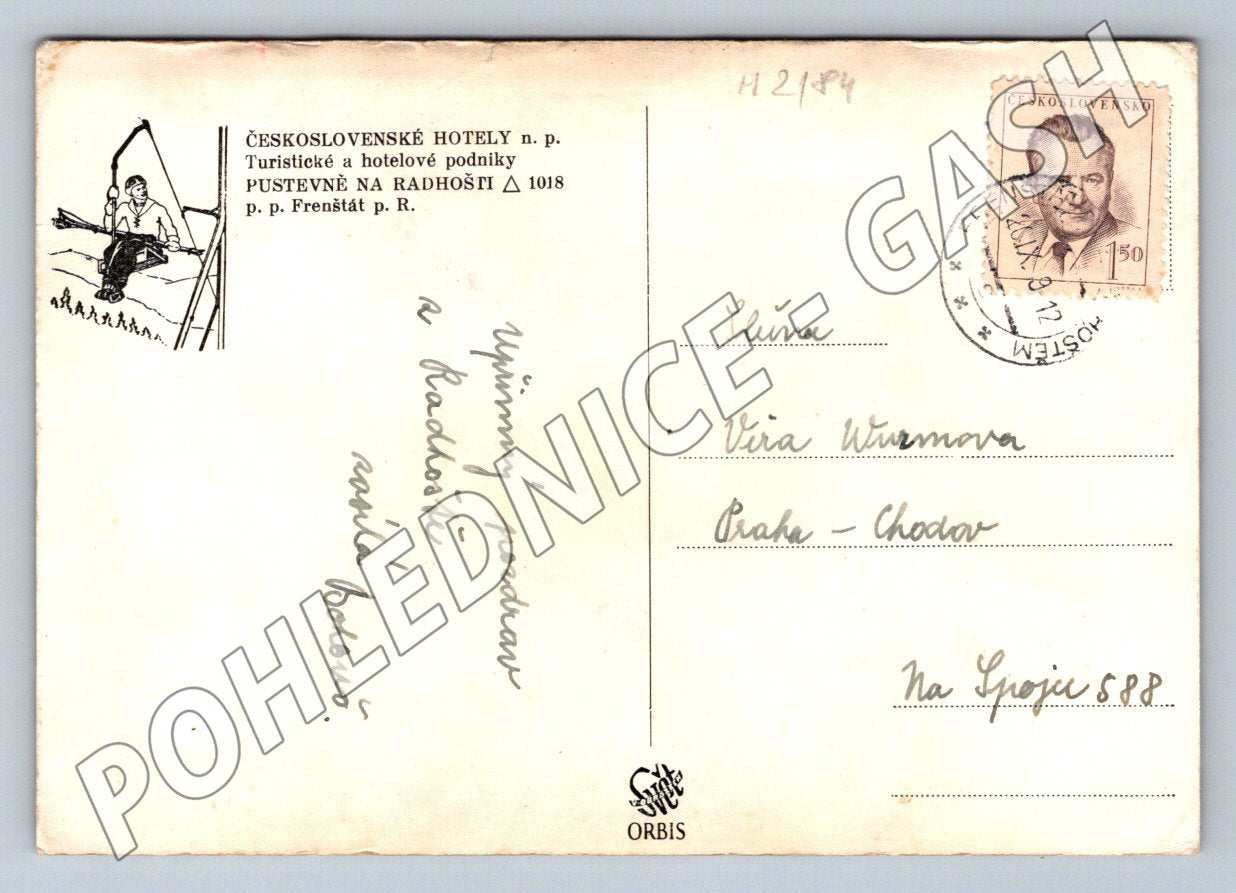 Doplněná černobílá pohlednice zachycuje známý turistický areál Pustevny na Radhošti, ležící v Beskydech. Pohlednice je opatřena historickou známkou a prošla poštou, na zadní straně je ručně psaný text a adresa adresáta z období Československa. Na přední straně je pohled na typické valašské stavby a okolní přírodu. Vhodné pro sběratele i milovníky historie Beskyd včetně dobové architektury a turistiky. Vydavatel Orbis, hotelová síť ČSSR, přibližný stav dle fotografií, viz opotřebení odpovídající stáří pohlednice.