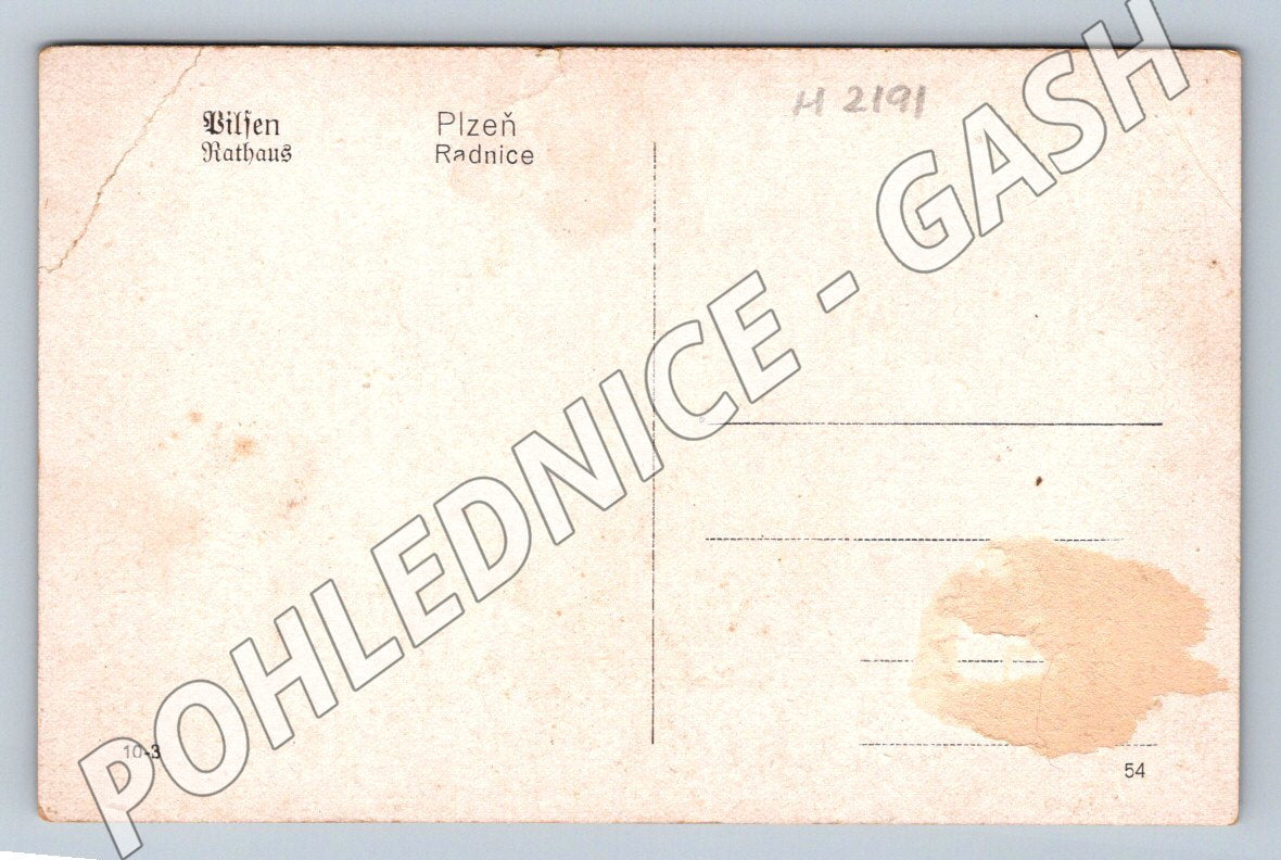 Starší černobílá pohlednice zachycující historickou radnici v Plzni. Na přední straně je detailní záběr na budovu s bohatě zdobenými štíty, hodinami a věžičkou. Zadní strana je nepopsaná, s drobnými stopami po nalepení a známkami stáří - jemné ohyby, skvrnky a drobné oděrky, včetně zbytku poštovního lepidla v dolní části. Pohlednice je dvojjazyčně popsána (Plzeň – Radnice / Pilsen – Rathaus). Zajímavý sběratelský kousek vhodný pro milovníky starých pohlednic z období do roku 1950, místopisné pohlednice i zájemce o architekturu českých měst.