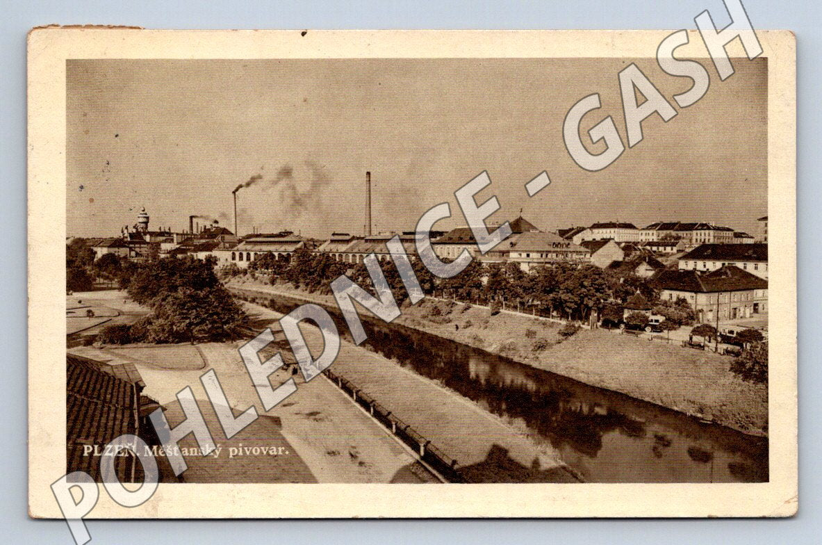 Originální stará pohlednice zobrazující slavný Městský pivovar v Plzni. Na přední straně je černobílý pohled na historickou budovu pivovaru s komínem a okolní říční krajinou. Zadní strana obsahuje ručně psaný pozdrav, adresu a poštovní známku s razítkem. Pohlednice pochází pravděpodobně z první poloviny 20. století. Zachovalý sběratelský stav, drobné opotřebení odpovídající stáří. Ideální pro sběratele historických pohlednic z Čech a zájemce o historii Plzně či pivovarnictví.