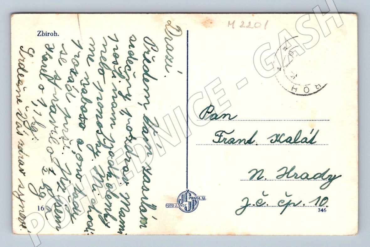 Nabízím starou černobílou pohlednici s pohledem na Zbiroh. Na vyvýšenině dominuje známý zámek Zbiroh s krásným výhledem na okolní krajinu a pod ním se rozprostírá malebná obec s poli v popředí. Na zadní straně pohlednice je rukopisný vzkaz, poštovní razítko i adresace. Zajímavý sběratelský kus z období první poloviny 20. století. Pohlednice je v pěkném sběratelském stavu s drobnými známkami stáří. Originální fotografie J. Svěrák, Praha. Vhodné pro sběratele pohlednic s tématem hradů a zámků nebo regionální historie.