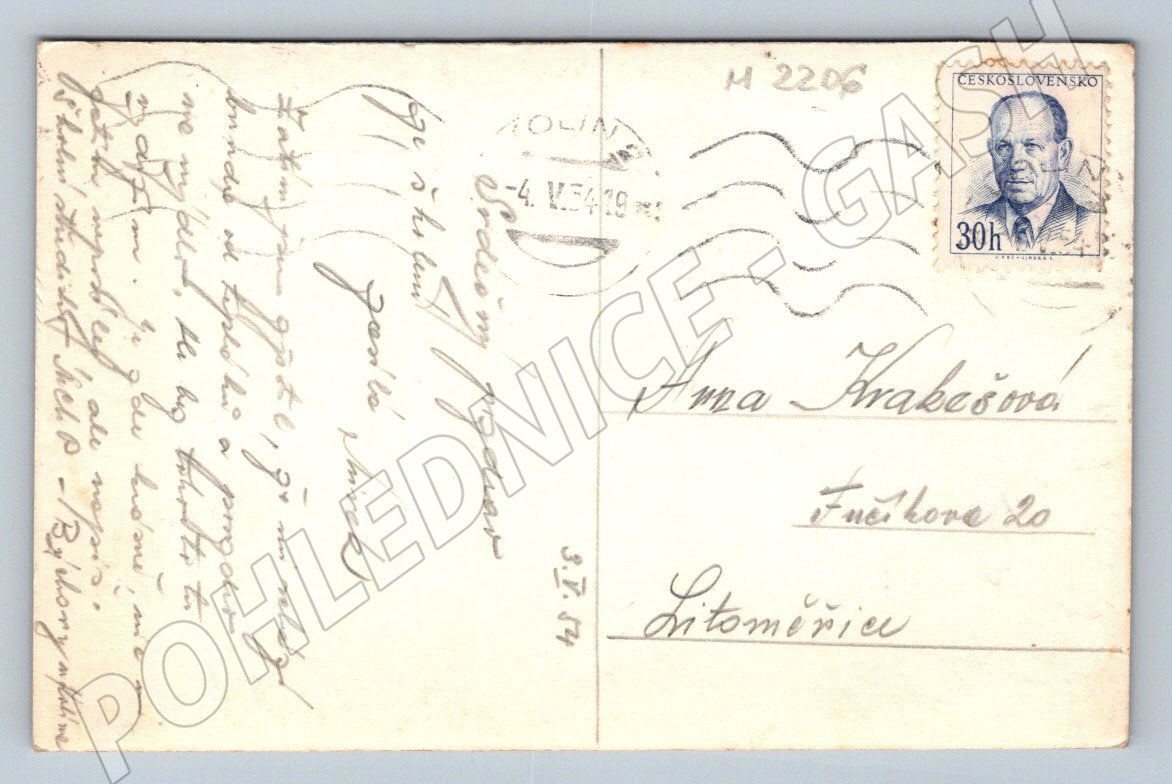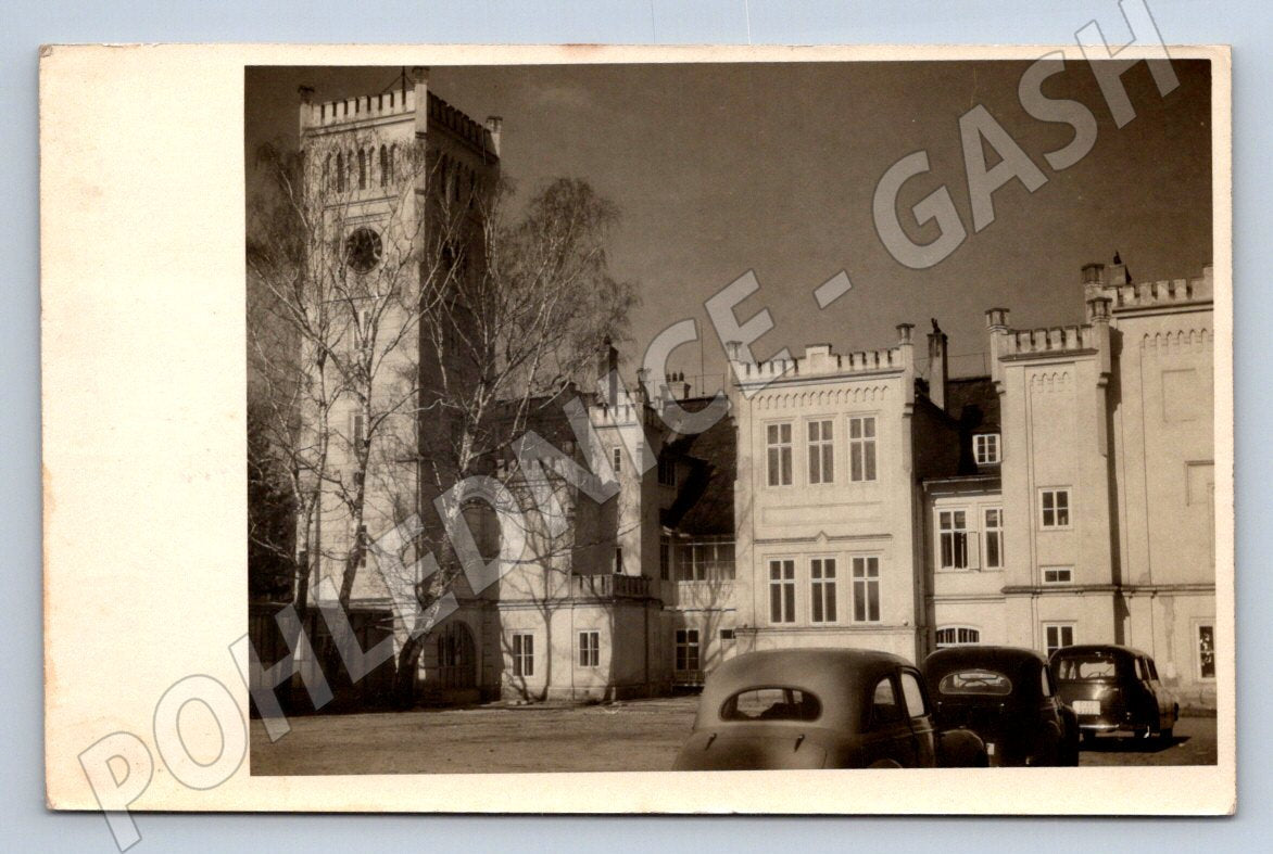 Originální pohlednice zachycující historickou budovu zámku s výraznou věží, pravděpodobně v České republice. Černobílá fotografie na pohlednici ukazuje část zámku a dobová auta zaparkovaná před ním, což dodává snímku dobovou atmosféru. Na zadní straně je pohlednice vyplněna rukopisem, opatřena známkou a poštovními razítky, což dokládá její skutečné odeslání. Vhodné pro sběratele pohlednic, historických míst nebo milovníky architektury. Stav pohlednice odpovídá jejímu stáří, viz foto.