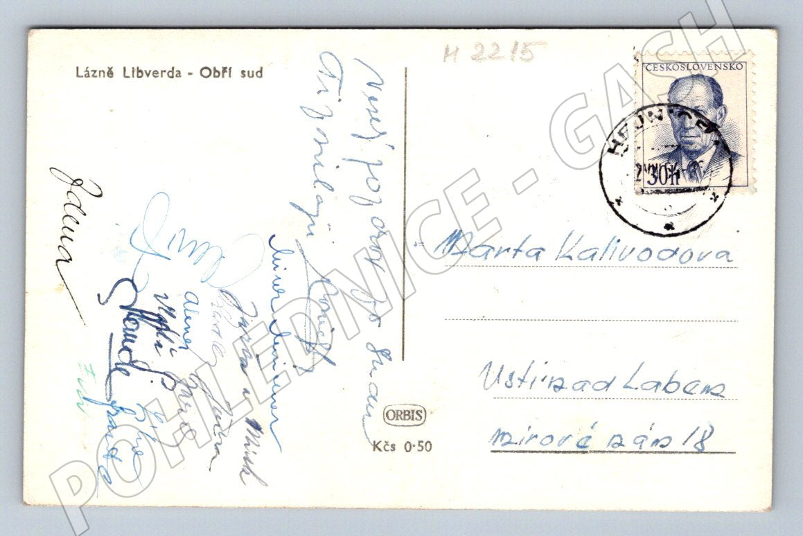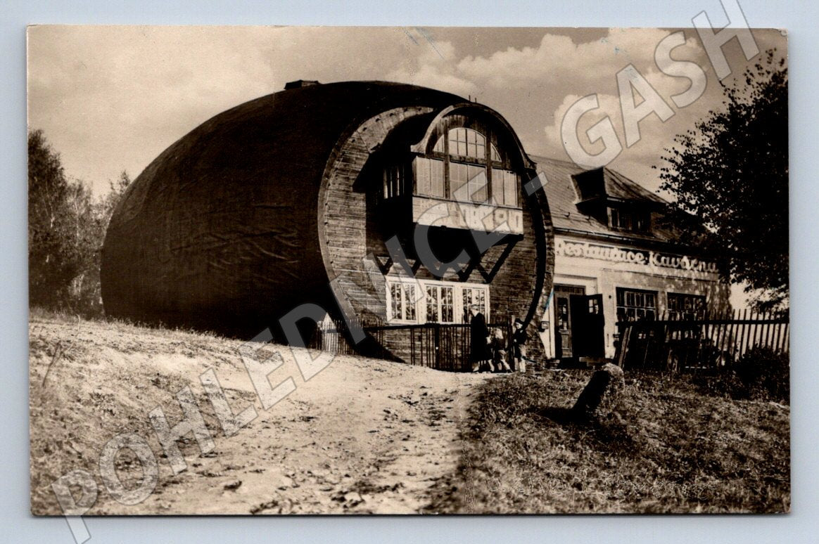 Originální černobílá pohlednice s motivem známé stavby Obří sud v Lázních Libverda, jedné z architektonických zajímavostí severních Čech. Pohlednice zachycuje hlavní budovu restaurace a posezení před objektem. Na zadní straně je ručně psaný pozdrav, adresováno do Ústí nad Labem, s dobovou známkou a razítkem. Vydal Orbis, cena 0,50 Kčs. Krásný sběratelský kousek dokumentující historii českých lázní a architektury. Stav pohlednice odpovídá stáří, viz foto.
