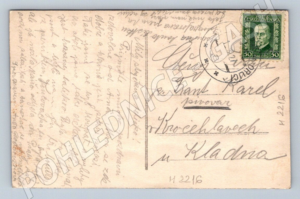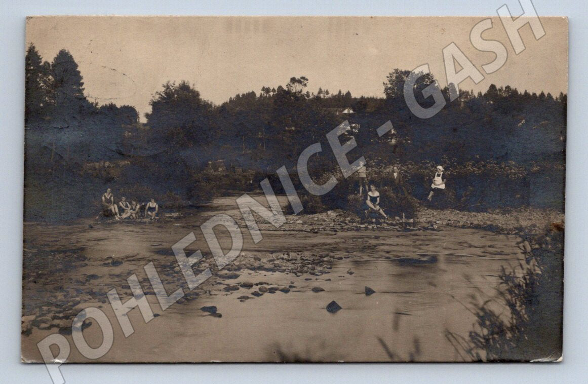 Starobylá pohlednice z období první poloviny 20. století, která zachycuje idylickou scénu u české říčky. Na přední straně můžete vidět skupinu lidí, pravděpodobně rodinu nebo přátele, jak tráví léto u vody v přírodě, obklopeni typickou krajinou tehdejšího venkova. Pohlednice je originálně prošlá poštou, na zadní straně je dochované ručně psané sdělení s adresou a dobovou známkou s portrétem prezidenta T. G. Masaryka v hodnotě 50 haléřů. Hezký sběratelský stav, drobné opotřebení okrajů. Vyhledávaný kus pro sběratele české historie, starých pohlednic nebo milovníky nostalgických pohledů do minulosti.