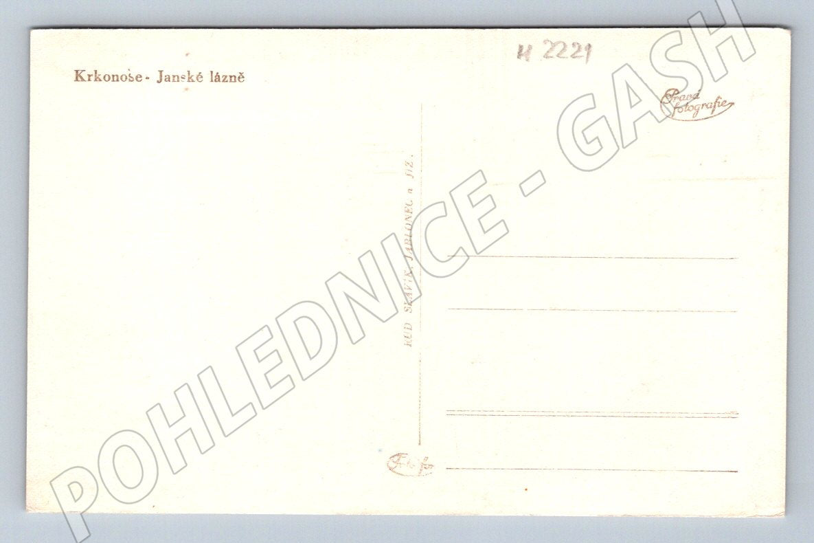 Originální černobílá pohlednice zachycující zimní pohled na lázeňské město Janské Lázně v Krkonoších. Na přední straně pohlednice je krásně vidět panorama města obklopeného horami a zasněženou krajinou, v popředí je kostel a lázeňské budovy. Na zadní straně je uveden nápis Krkonoše - Janské lázně a prostor pro adresu i známku je nepopsaný. Pravděpodobně se jedná o pohlednici vydanou před rokem 1950, vhodnou pro sběratele historických pohlednic nebo milovníky Krkonoš a lázeňských měst. Stav velmi dobrý, viz sken.